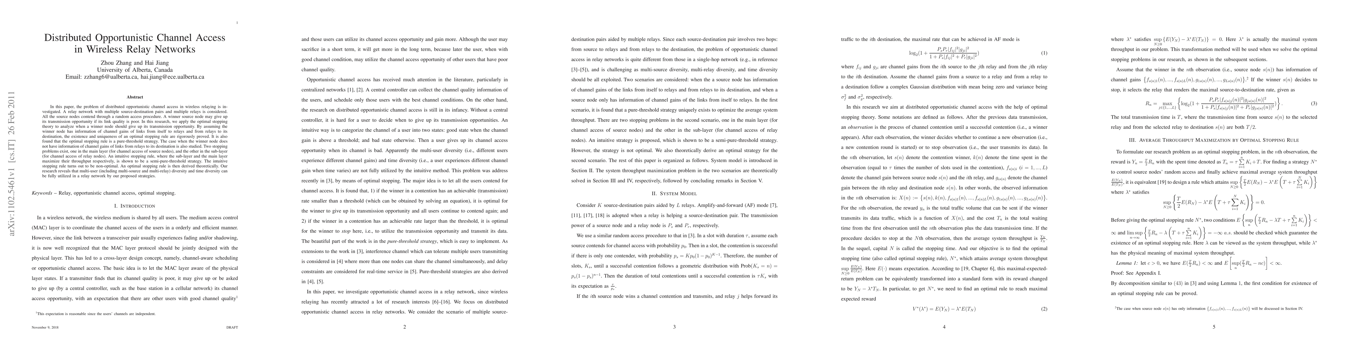 This paper investigates distributed opportunistic channel access in wireless relay networks, applying optimal stopping theory to determine when a winning source node should abandon its transmission opportunity based on link quality. The research proves the existence and uniqueness of an optimal stopping rule, which is a pure-threshold strategy, and derives an optimal stopping rule for scenarios where source nodes lack relay-to-destination channel information.