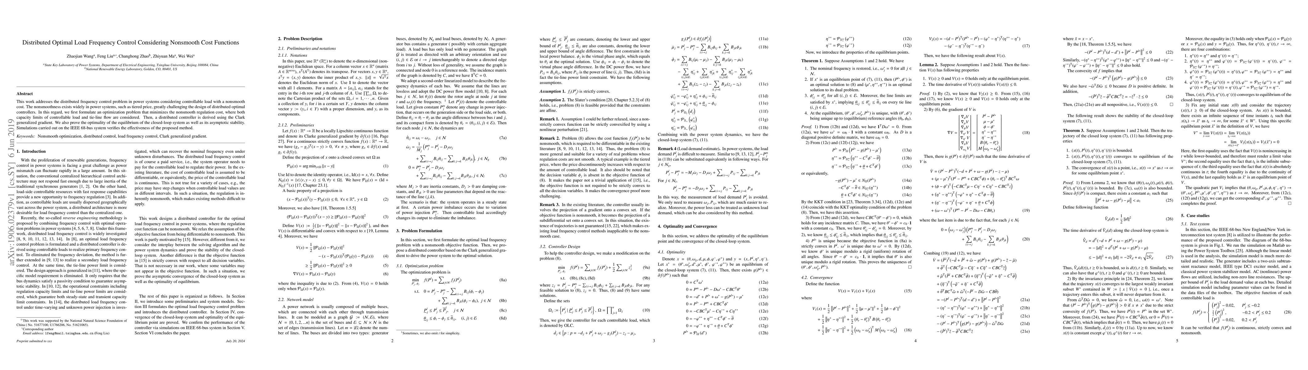 This paper proposes a distributed optimal load frequency control method for power systems with nonsmooth cost functions, such as tiered pricing, by formulating an optimization problem and deriving a distributed controller using the Clark generalized gradient. The method is proven to achieve optimal equilibrium and asymptotic stability, verified through simulations on the IEEE 68-bus system.