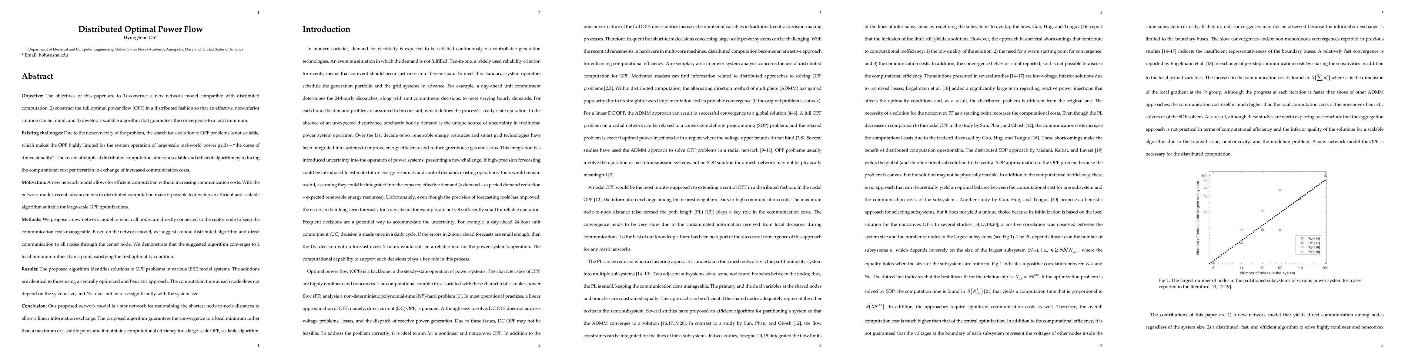 Abstract Objective: The objectives of this paper are to 1) construct a new network model compatible with distributed computation, 2) construct the full optimal power flow (OPF) in a distributed fashion so that an effective, non-inferior solution can be found, and 3) develop a scalable algorithm that guarantees the convergence to a local minimum.