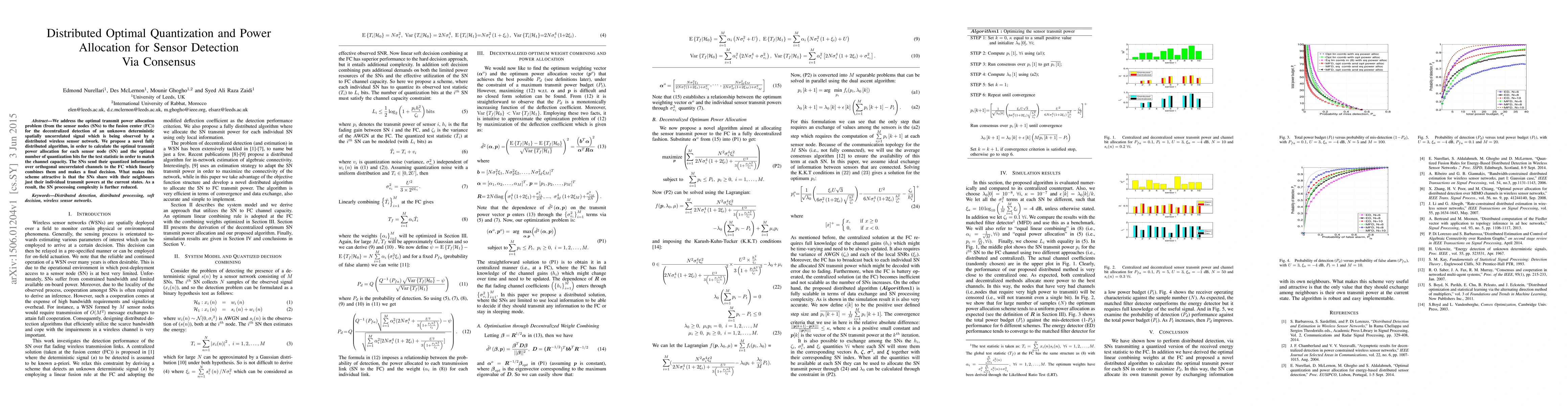 This paper proposes a novel distributed algorithm for optimal power allocation and quantization in a wireless sensor network, aiming to minimize transmit power while maintaining detection accuracy. The algorithm enables sensor nodes to share only their transmit power levels with neighbors, reducing processing complexity.