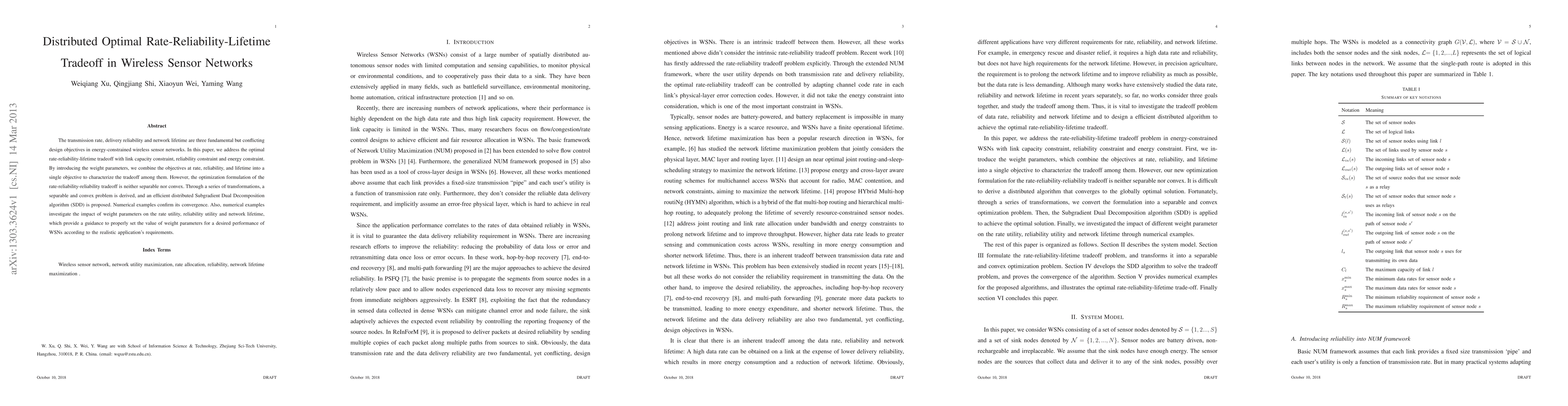 A new algorithm is proposed to optimize the tradeoff between transmission rate, delivery reliability, and network lifetime in wireless sensor networks while considering energy constraints and link capacity limitations.