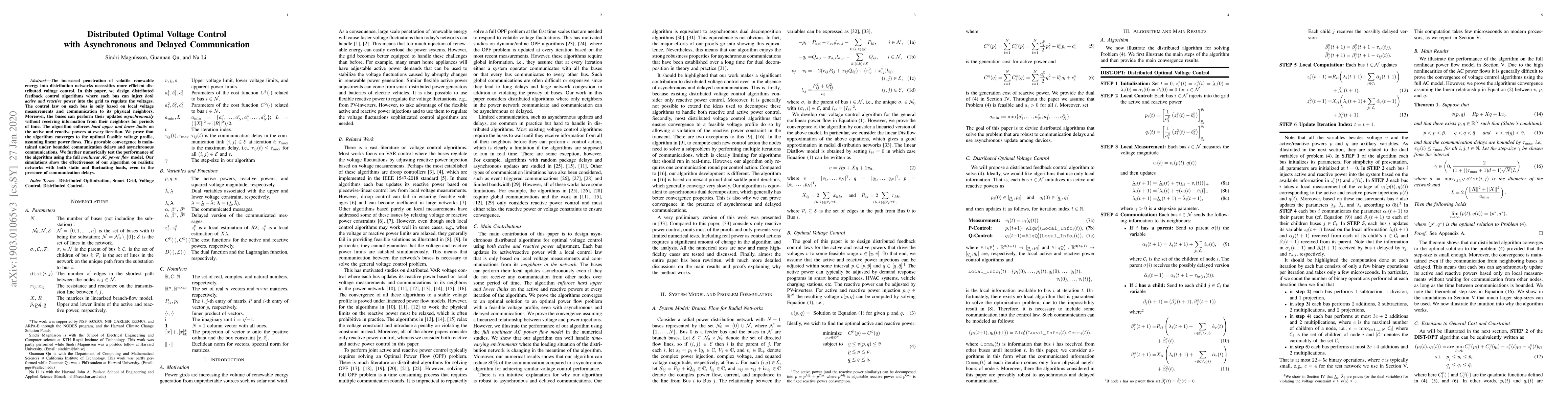 This paper proposes a distributed voltage control algorithm that allows buses to regulate voltages using local measurements and asynchronous updates, even with communication delays. The algorithm guarantees convergence to the optimal voltage profile under linear and nonlinear power flow models, demonstrating effectiveness in realistic networks.
