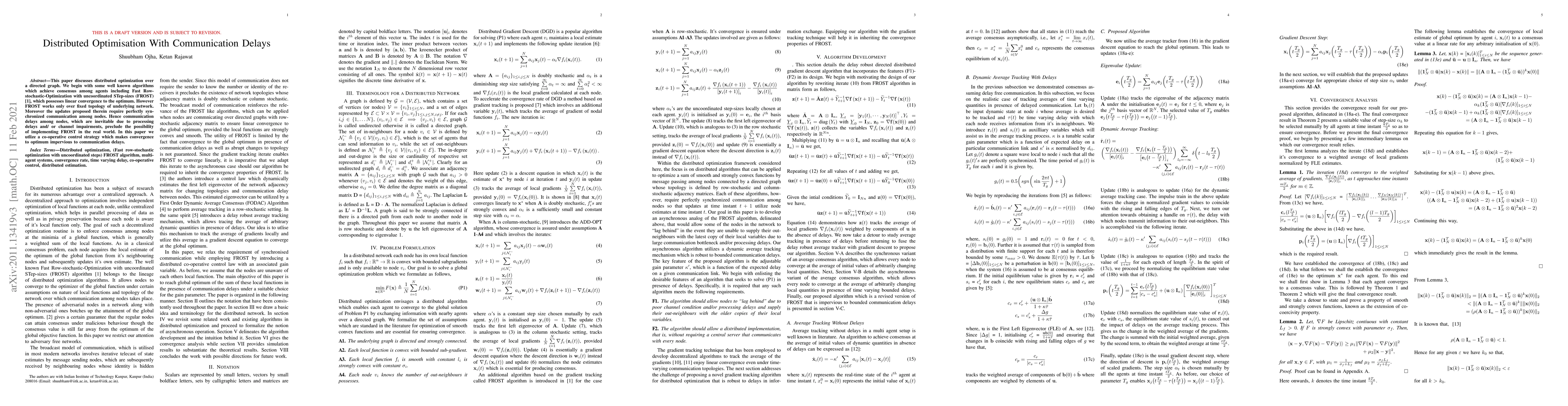 This paper discusses distributed optimization over a directed graph. We begin with some well known algorithms which achieve consensus among agents including FROST [1], which possesses the quickest convergence to the optimum. It is a well known fact FROST has a linear convergence. However FROST works only over fixed topology of underlying network. Moreover the updates proposed therein require perfectly synchronized communication among nodes. Hence communication delays among nodes, which are inevitable in a realistic scenario, preclude the possibility of implementing FROST in real time. In this paper we introduce a co-operative control strategy which makes convergence to optimum robust to communication delays.