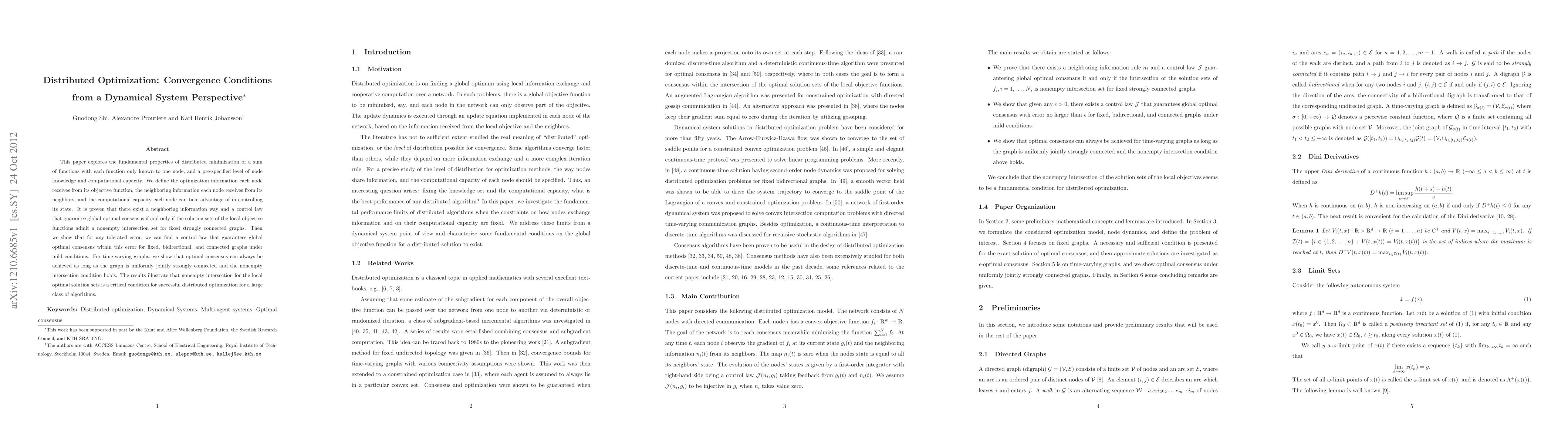 This paper explores the fundamental properties of distributed minimization of a sum of functions with each function only known to one node, and a pre-specified level of node knowledge and computational capacity. We define the optimization information each node receives from its objective function, the neighboring information each node receives from its neighbors, and the computational capacity each node can take advantage of in controlling its state. It is proven that there exist a neighboring information way and a control law that guarantee global optimal consensus if and only if the solution sets of the local objective functions admit a nonempty intersection set for fixed strongly connected graphs. Then we show that for any tolerated error, we can find a control law that guarantees global optimal consensus within this error for fixed, bidirectional, and connected graphs under mild conditions. For time-varying graphs, we show that optimal consensus can always be achieved as long as the graph is uniformly jointly strongly connected and the nonempty intersection condition holds. The results illustrate that nonempty intersection for the local optimal solution sets is a critical condition for successful distributed optimization for a large class of algorithms.