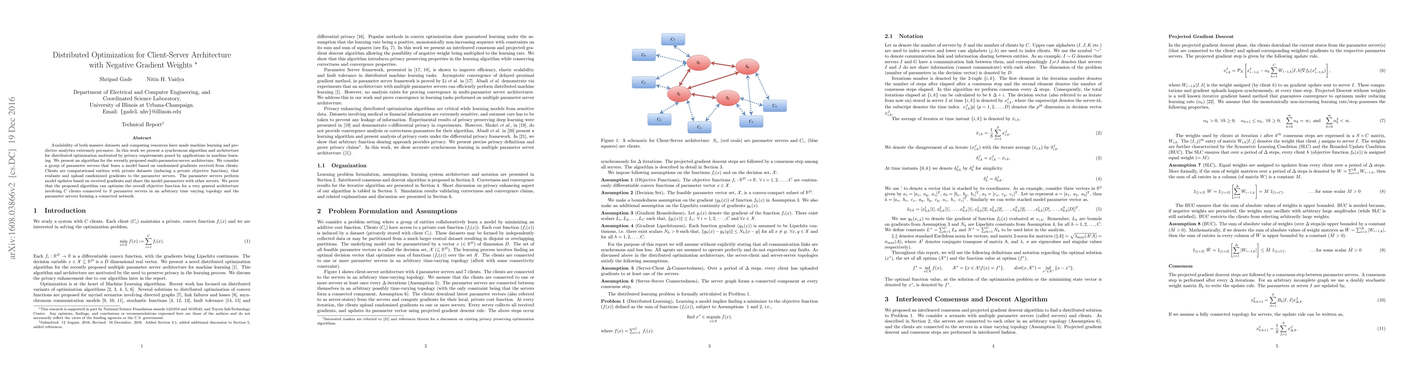Availability of both massive datasets and computing resources have made machine learning and predictive analytics extremely pervasive. In this work we present a synchronous algorithm and architecture for distributed optimization motivated by privacy requirements posed by applications in machine learning. We present an algorithm for the recently proposed multi-parameter-server architecture. We consider a group of parameter servers that learn a model based on randomized gradients received from clients. Clients are computational entities with private datasets (inducing a private objective function), that evaluate and upload randomized gradients to the parameter servers. The parameter servers perform model updates based on received gradients and share the model parameters with other servers. We prove that the proposed algorithm can optimize the overall objective function for a very general architecture involving $C$ clients connected to $S$ parameter servers in an arbitrary time varying topology and the parameter servers forming a connected network.