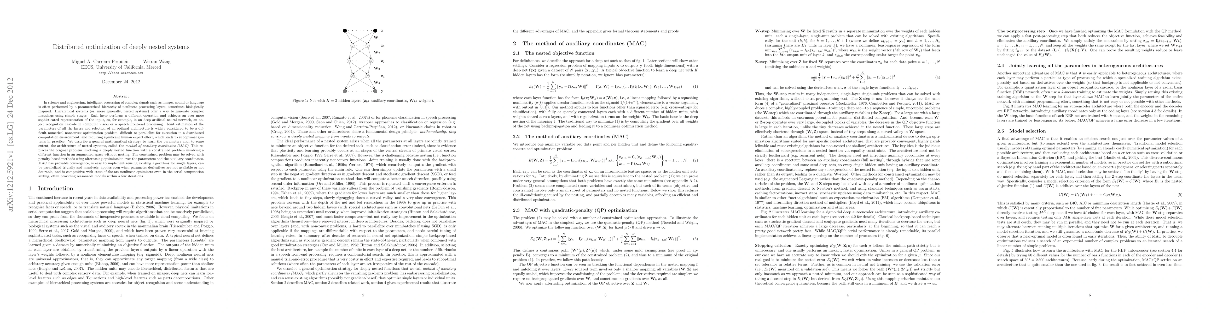 This paper proposes a method of auxiliary coordinates (MAC) to optimize the parameters and architecture of nested systems, such as deep neural networks, by transforming the original nonconvex optimization problem into a constrained problem in an augmented space. MAC is parallelizable, easy to implement, and competitive with state-of-the-art optimizers.
