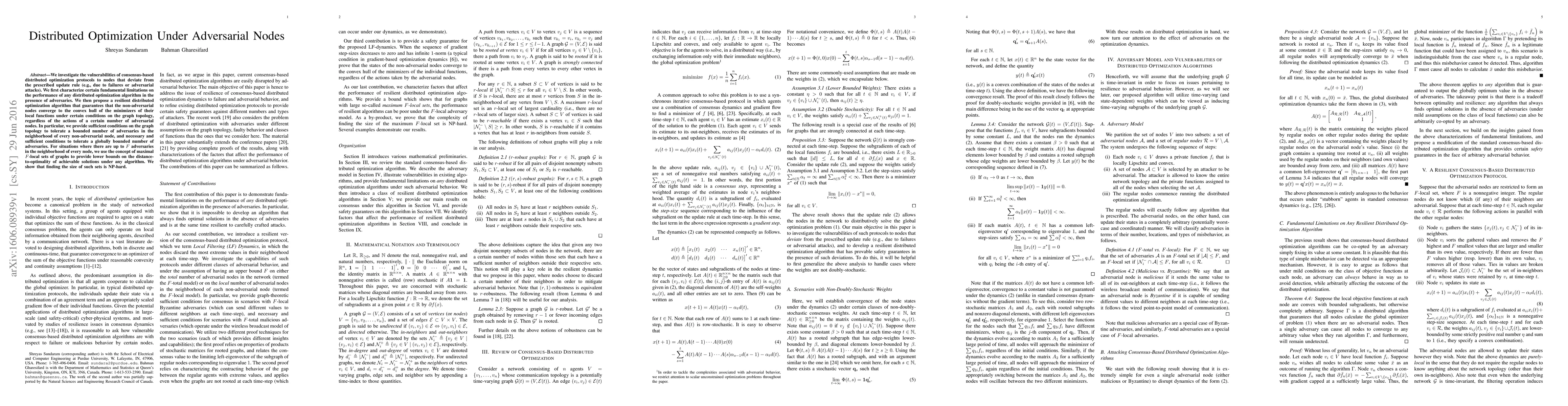 Researchers developed a resilient distributed optimization algorithm that can guarantee convergence to optimal solutions despite the presence of adversarial nodes, finding limitations on performance and providing conditions for tolerating up to F adversaries in each neighborhood.