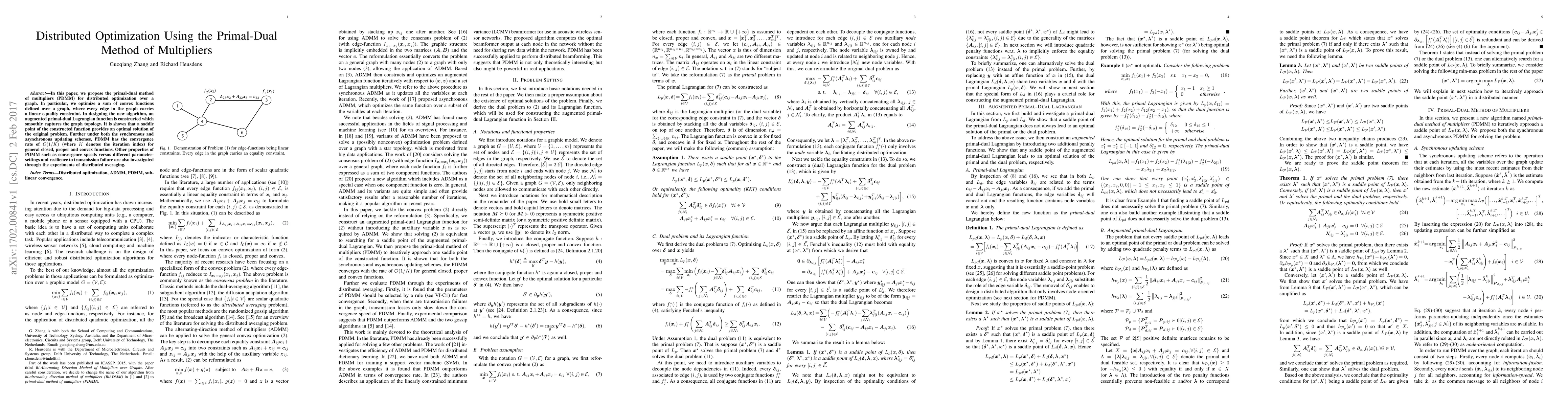 This paper introduces the primal-dual method of multipliers (PDMM) for distributed optimization over a graph, leveraging an augmented Lagrangian function to handle linear equality constraints. The method converges at a rate of O(1/K) under both synchronous and asynchronous updates, and experiments demonstrate its performance in distributed averaging scenarios.