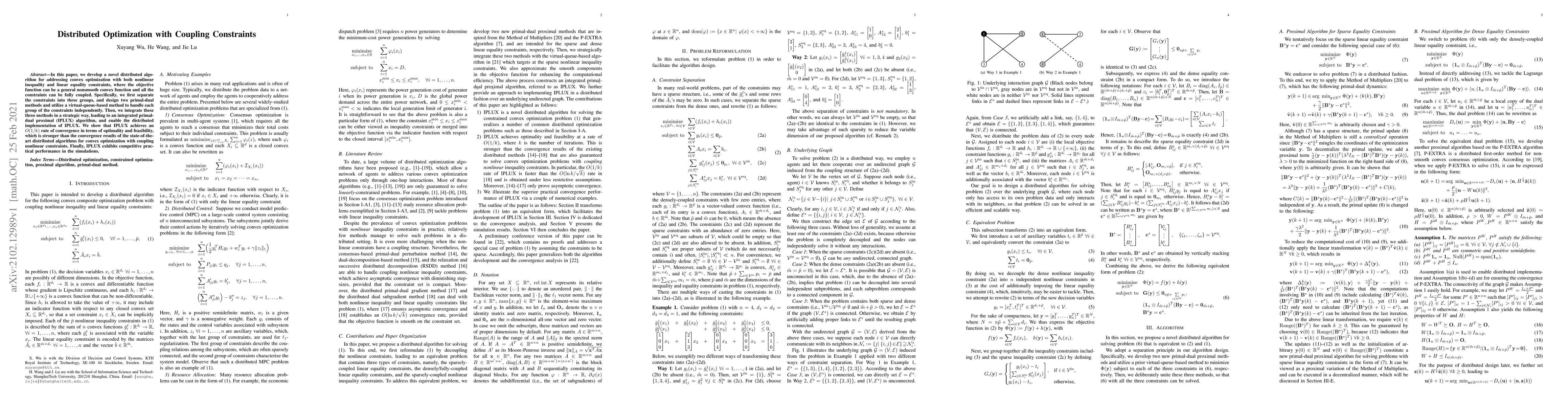 In this paper, we develop a novel distributed algorithm for addressing convex optimization with both nonlinear inequality and linear equality constraints, where the objective function can be a general nonsmooth convex function and all the constraints can be fully coupled. Specifically, we first separate the constraints into three groups, and design two primal-dual methods and utilize a virtual-queue-based method to handle each group of the constraints independently. Then, we integrate these three methods in a strategic way, leading to an integrated primal-dual proximal (IPLUX) algorithm, and enable the distributed implementation of IPLUX. We show that IPLUX achieves an $O(1/k)$ rate of convergence in terms of optimality and feasibility, which is stronger than the convergence results of the state-of-the-art distributed algorithms for convex optimization with coupling nonlinear constraints. Finally, IPLUX exhibits competitive practical performance in the simulations.
