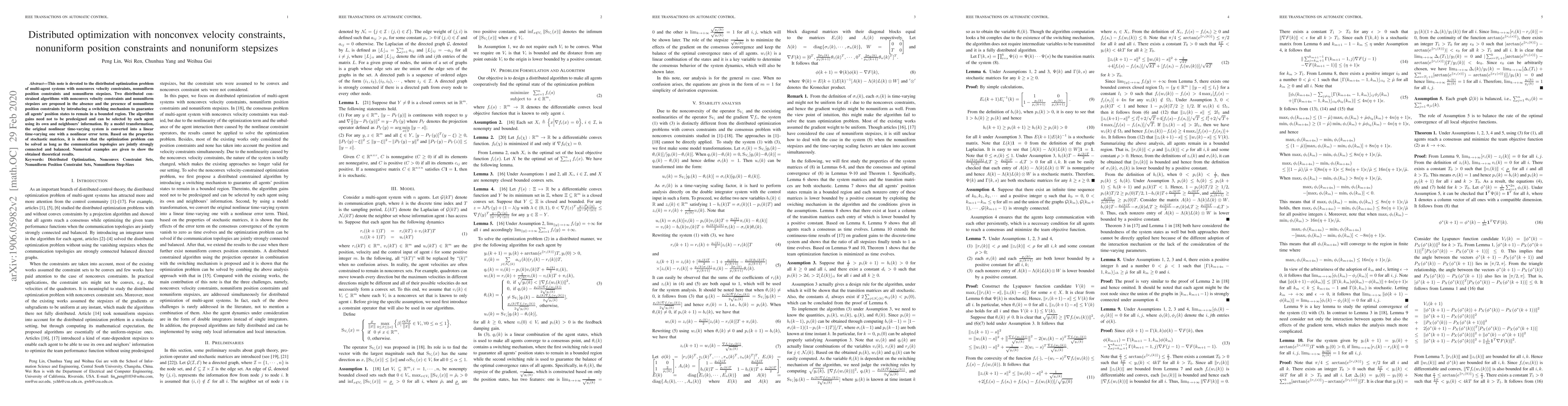 This note is devoted to the distributed optimization problem of multi-agent systems with nonconvex velocity constraints, nonuniform position constraints and nonuniform stepsizes. Two distributed constrained algorithms with nonconvex velocity constraints and nonuniform stepsizes are proposed in the absence and the presence of nonuniform position constraints by introducing a switching mechanism to guarantee all agents' position states to remain in a bounded region. The algorithm gains need not to be predesigned and can be selected by each agent using its own and neighbours' information. By a model transformation, the original nonlinear time-varying system is converted into a linear time-varying one with a nonlinear error term. Based on the properties of stochastic matrices, it is shown that the optimization problem can be solved as long as the communication topologies are jointly strongly connected and balanced. Numerical examples are given to show the obtained theoretical results.