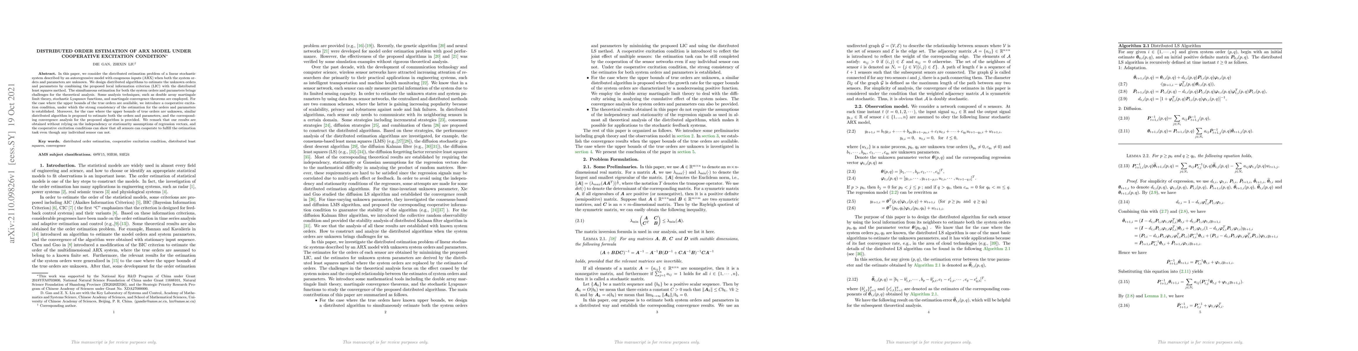 This paper proposes distributed algorithms for estimating unknown orders and parameters in an ARX model under cooperative excitation conditions, using a combination of local information criteria and distributed least squares. The algorithms achieve strong consistency without requiring independence or stationarity of regression vectors, leveraging cooperative excitation to enable collective estimation despite individual sensor limitations.