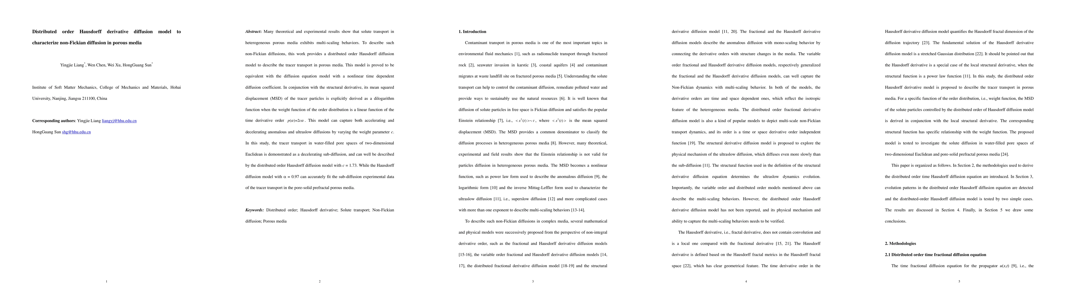 This paper introduces a distributed order Hausdorff derivative diffusion model to characterize non-Fickian diffusion in heterogeneous porous media, demonstrating its ability to capture both accelerating and decelerating anomalous diffusions. The model fits sub-diffusion experimental data in water-filled pore spaces, showing its effectiveness in describing complex solute transport behaviors.