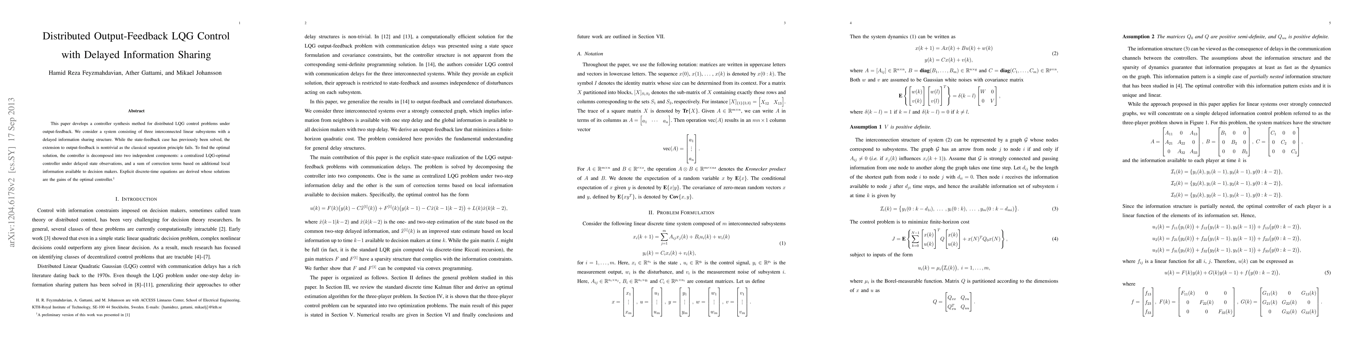 This paper proposes a controller synthesis method for distributed LQG control under output-feedback, addressing the challenge of delayed information sharing among interconnected subsystems. It decomposes the controller into a centralized LQG-optimal component and local correction terms, deriving explicit discrete-time equations for the optimal controller gains.
