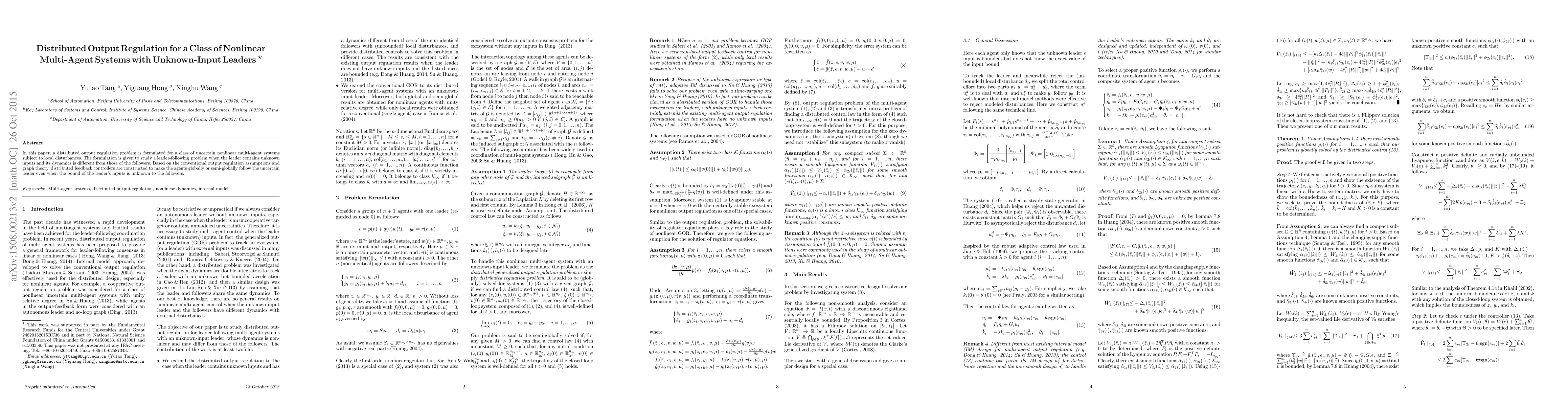 This paper formulates a distributed output regulation problem for uncertain nonlinear multi-agent systems with unknown-input leaders, constructing distributed feedback controllers to ensure followers can track the leader despite unknown input bounds, leveraging conventional regulation assumptions and graph theory.