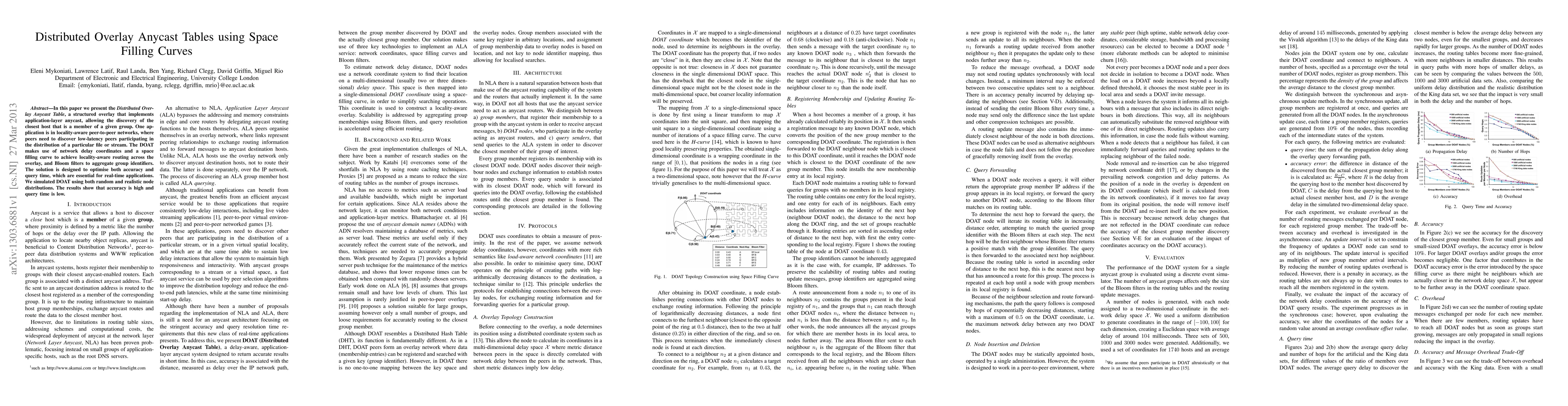 In this paper we present the \emph{Distributed Overlay Anycast Table}, a structured overlay that implements application-layer anycast, allowing the discovery of the closest host that is a member of a given group. One application is in locality-aware peer-to-peer networks, where peers need to discover low-latency peers participating in the distribution of a particular file or stream. The DOAT makes use of network delay coordinates and a space filling curve to achieve locality-aware routing across the overlay, and Bloom filters to aggregate group identifiers. The solution is designed to optimise both accuracy and query time, which are essential for real-time applications. We simulated DOAT using both random and realistic node distributions. The results show that accuracy is high and query time is low.
