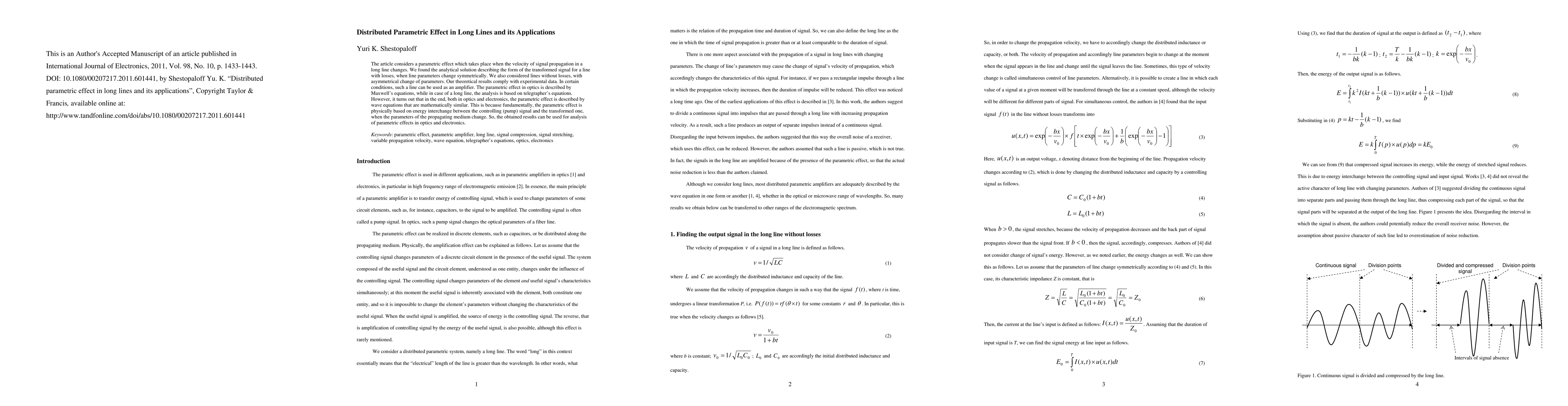 The article considers a parametric effect which takes place when the velocity of signal propagation in a long line changes. We found the analytical solution describing the form of the transformed signal for a line with losses, when line parameters change symmetrically. We also considered lines without losses, with asymmetrical change of parameters. Our theoretical results comply with experimental data. In certain conditions, such a line can be used as an amplifier. The parametric effect in optics is described by Maxwell's equations, while in case of a long line, the analysis is based on telegrapher's equations. However, it turns out that in the end, both in optics and electronics, the parametric effect is described by wave equations that are mathematically similar. This is because fundamentally, the parametric effect is physically based on energy interchange between the controlling (pump) signal and the transformed one, when the parameters of the propagating medium change. So, the obtained results can be used for analysis of parametric effects in optics and electronics.