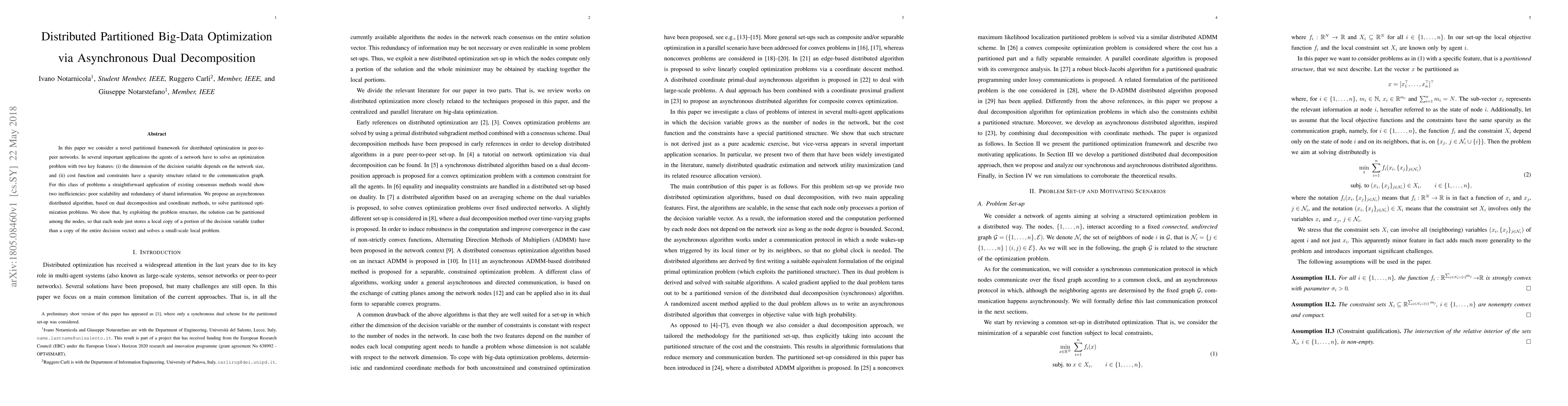 This paper proposes an asynchronous dual decomposition algorithm for distributed optimization in peer-to-peer networks, addressing scalability and information redundancy issues. The method partitions the optimization problem, allowing nodes to store local portions of the decision variable and solve small-scale local problems.