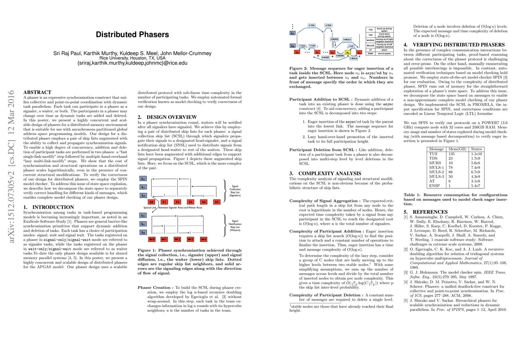 A phaser is an expressive synchronization construct that unifies collective and point-to-point coordination with dynamic task parallelism. Each task can participate in a phaser as a signaler, a waiter, or both. The participants in a phaser may change over time as dynamic tasks are added and deleted. In this poster, we present a highly concurrent and scalable design of phasers for a distributed memory environment that is suitable for use with asynchronous partitioned global address space programming models. Our design for a distributed phaser employs a pair of skip lists augmented with the ability to collect and propagate synchronization signals. To enable a high degree of concurrency, addition and deletion of participant tasks are performed in two phases: a "fast single-link-modify" step followed by multiple hand-overhand "lazy multi-link-modify" steps. We show that the cost of synchronization and structural operations on a distributed phaser scales logarithmically, even in the presence of concurrent structural modifications. To verify the correctness of our design for distributed phasers, we employ the SPIN model checker. To address this issue of state space explosion, we describe how we decompose the state space to separately verify correct handling for different kinds of messages, which enables complete model checking of our phaser design.