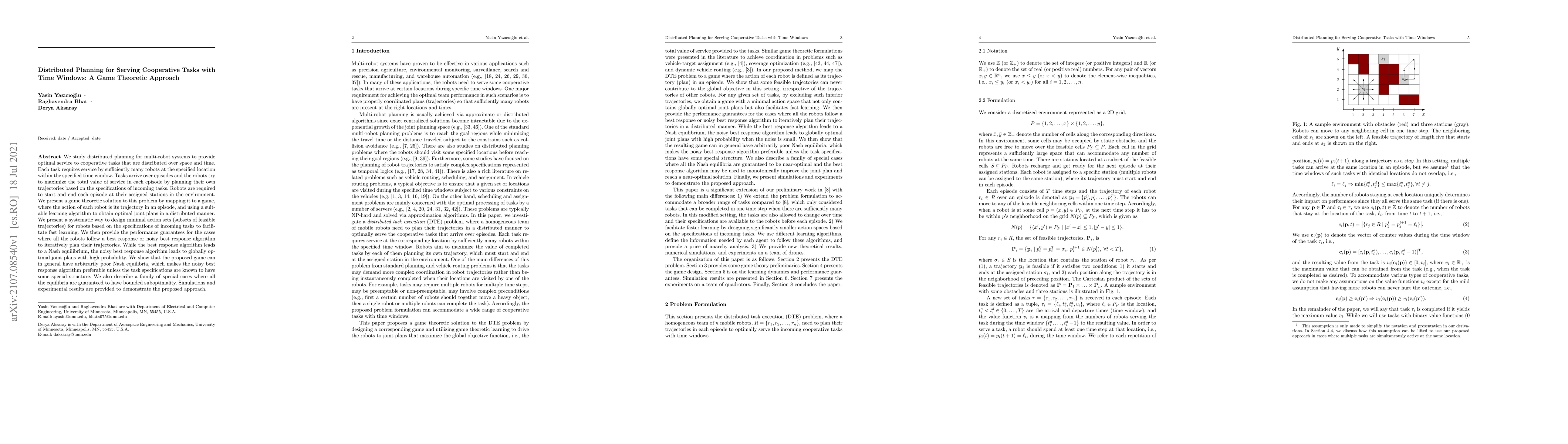 This paper proposes a game theoretic approach for distributed planning in multi-robot systems to optimally serve cooperative tasks with time windows. It introduces a learning algorithm to achieve optimal joint plans, showing that while the best response algorithm leads to a Nash equilibrium, the noisy best response algorithm achieves global optimality with high probability.