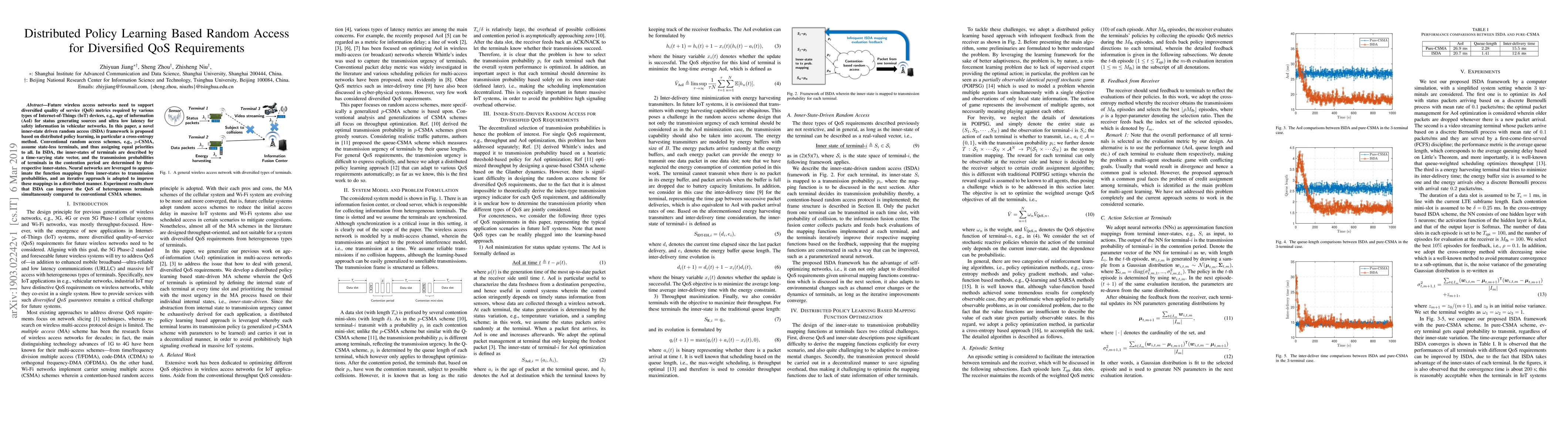 Future wireless access networks need to support diversified quality of service (QoS) metrics required by various types of Internet-of-Things (IoT) devices, e.g., age of information (AoI) for status generating sources and ultra low latency for safety information in vehicular networks. In this paper, a novel inner-state driven random access (ISDA) framework is proposed based on distributed policy learning, in particular a cross-entropy method. Conventional random access schemes, e.g., $p$-CSMA, assume state-less terminals, and thus assigning equal priorities to all. In ISDA, the inner-states of terminals are described by a time-varying state vector, and the transmission probabilities of terminals in the contention period are determined by their respective inner-states. Neural networks are leveraged to approximate the function mappings from inner-states to transmission probabilities, and an iterative approach is adopted to improve these mappings in a distributed manner. Experiment results show that ISDA can improve the QoS of heterogeneous terminals simultaneously compared to conventional CSMA schemes.