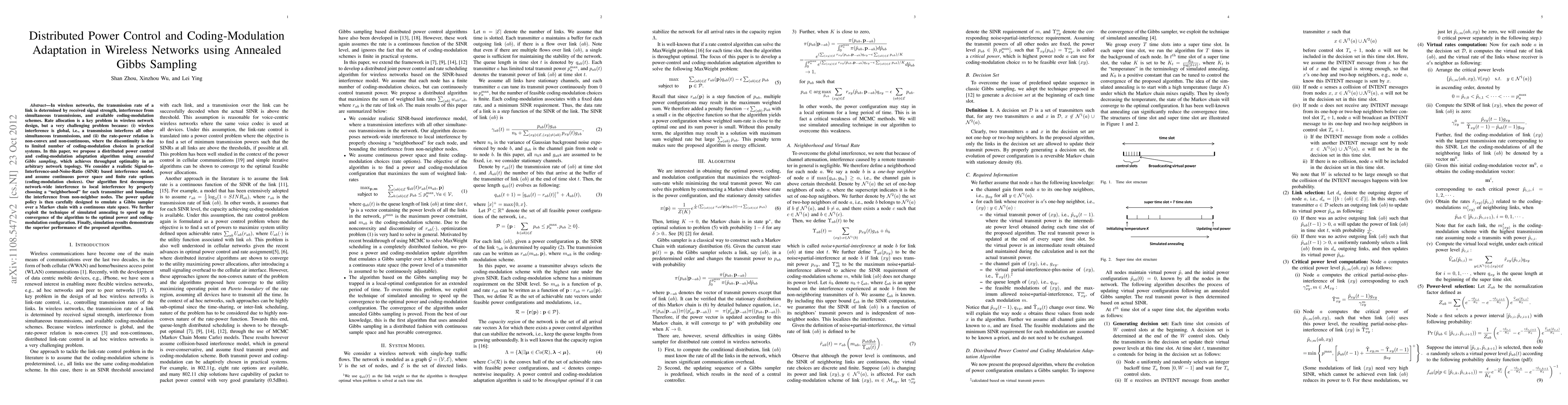 This paper proposes a distributed power control and coding-modulation adaptation algorithm using annealed Gibbs sampling for wireless networks, aiming to achieve throughput optimality. The algorithm decomposes global interference into local interference and employs simulated annealing to expedite convergence to optimal configurations.