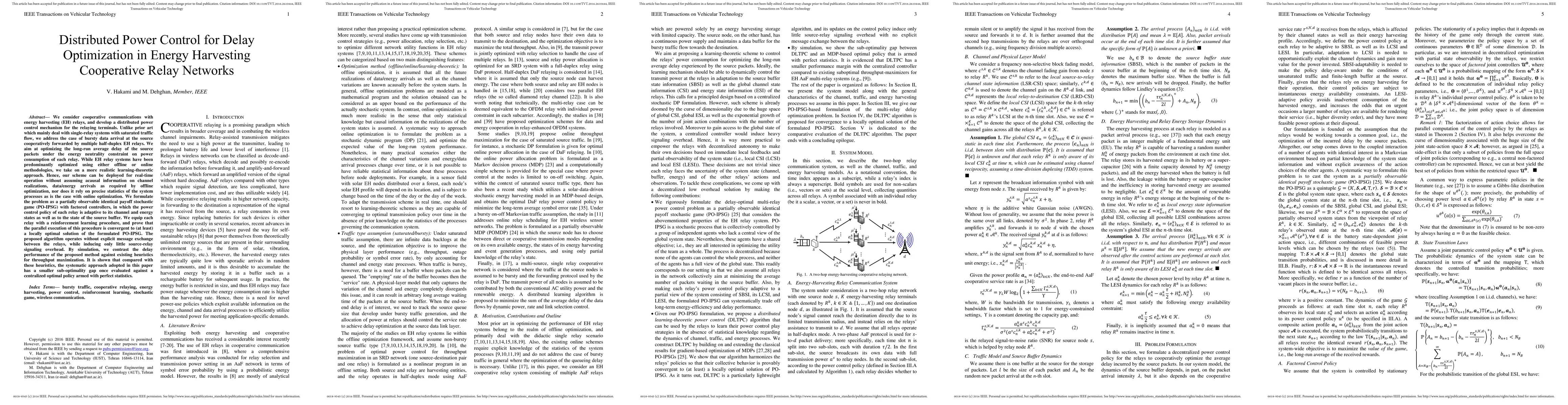This paper proposes a distributed power control mechanism for cooperative energy harvesting relays to optimize delay in bursty data communication networks, using a learning-theoretic approach without explicit message exchange between relays.