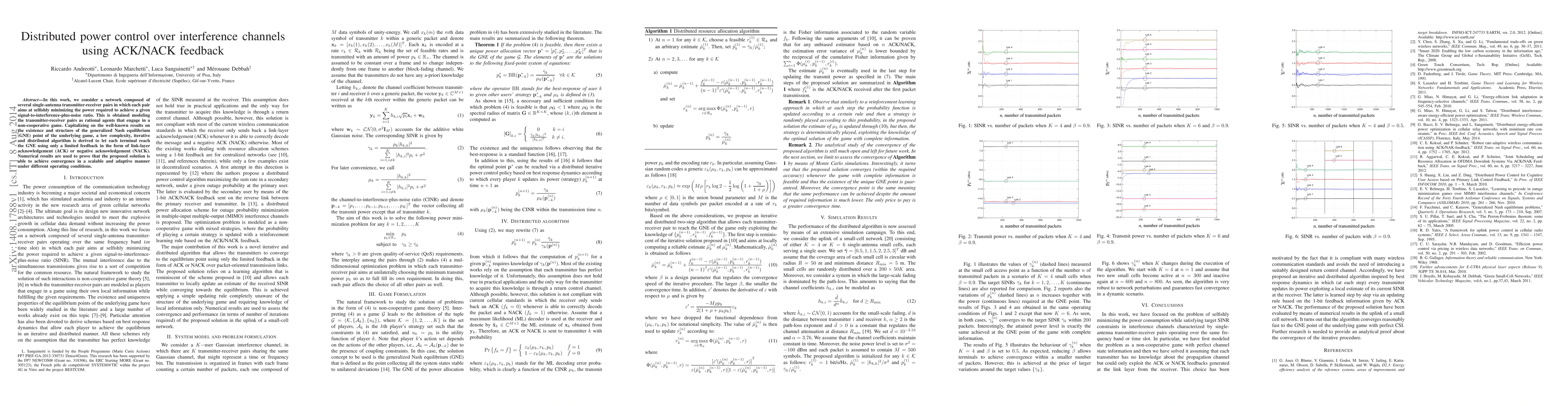 This paper proposes a distributed power control algorithm for single-antenna transmitter-receiver pairs in interference channels, modeled as a non-cooperative game. The algorithm leverages ACK/NACK feedback to iteratively reach the generalized Nash equilibrium, demonstrating scalability and adaptive convergence through numerical results.