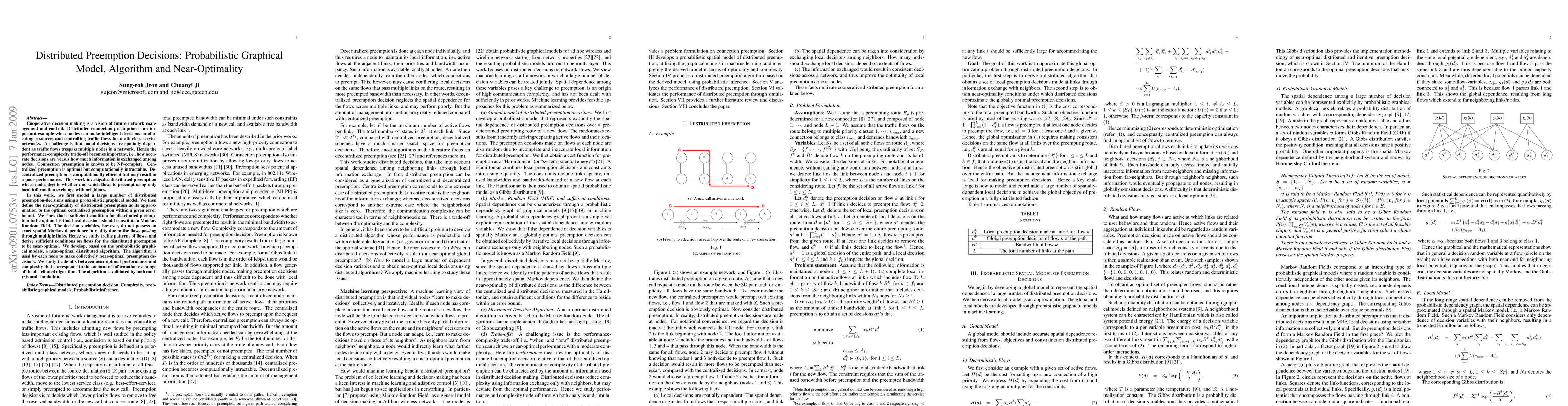 This paper proposes a probabilistic graphical model-based distributed algorithm for near-optimal connection preemption in multi-class service networks, balancing performance and information exchange complexity among nodes. The algorithm enables nodes to make collective, near-optimal decisions using local information, validated through analysis and simulation.