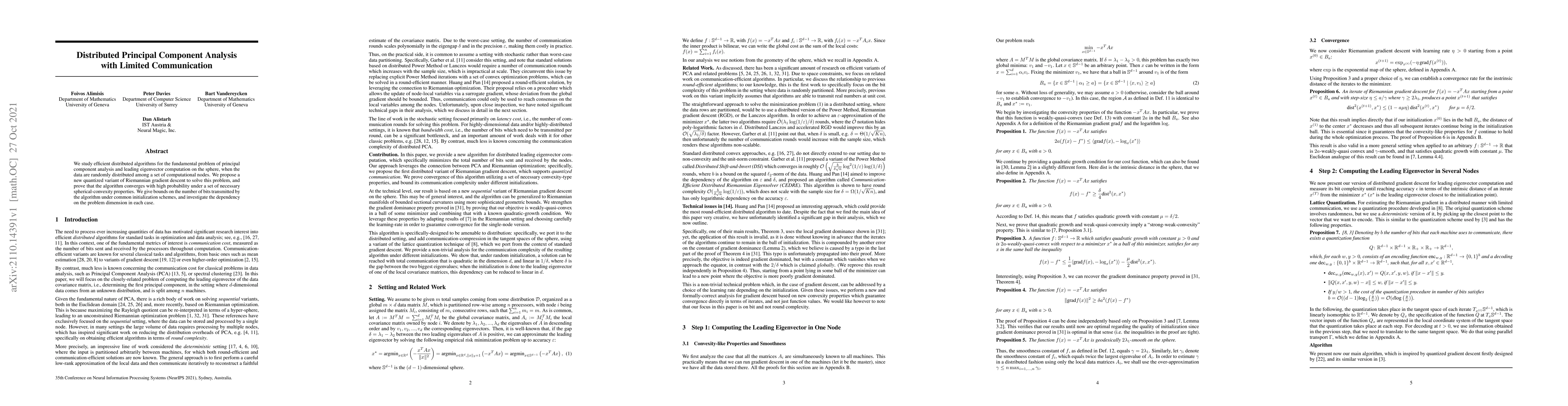 We study efficient distributed algorithms for the fundamental problem of principal component analysis and leading eigenvector computation on the sphere, when the data are randomly distributed among a set of computational nodes. We propose a new quantized variant of Riemannian gradient descent to solve this problem, and prove that the algorithm converges with high probability under a set of necessary spherical-convexity properties. We give bounds on the number of bits transmitted by the algorithm under common initialization schemes, and investigate the dependency on the problem dimension in each case.
