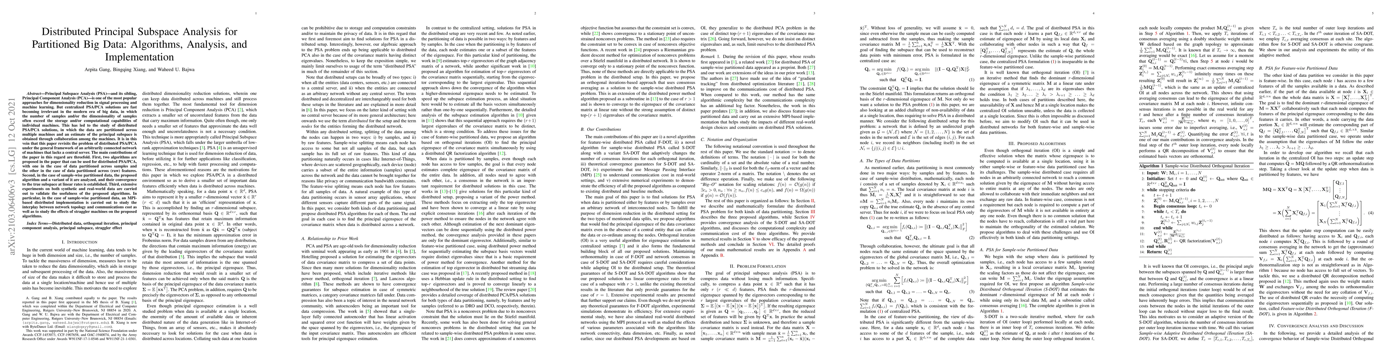 This paper proposes two distributed algorithms for Partitioned Big Data Principal Subspace Analysis, analyzing their convergence and performance. It also conducts experiments to validate the algorithms' effectiveness, including an MPI-based implementation to study the impact of network topology and straggler machines.