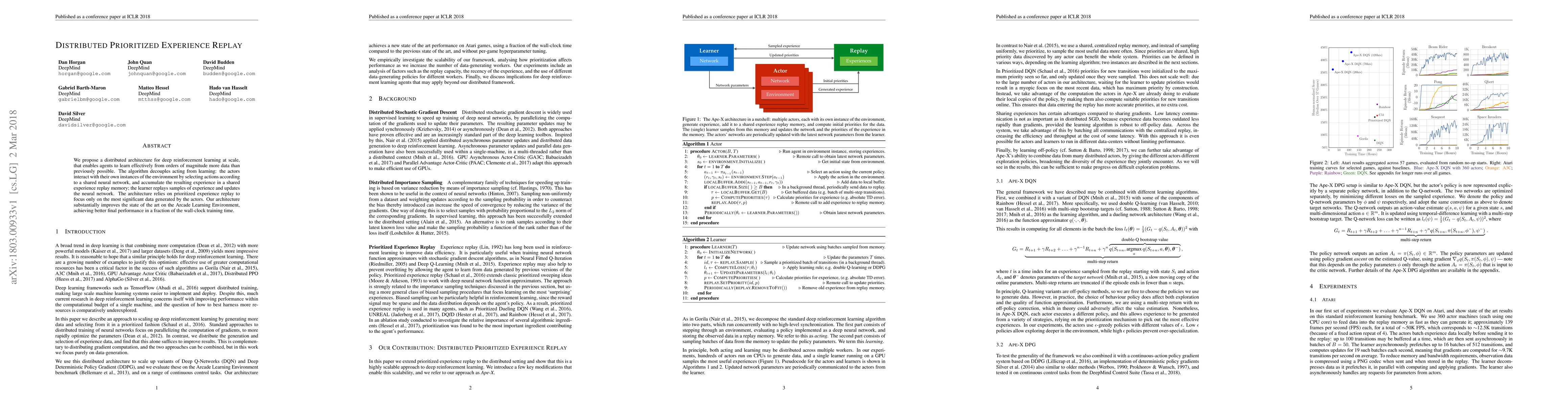 This paper introduces a distributed deep reinforcement learning architecture that leverages prioritized experience replay to efficiently utilize large datasets. It separates the acting and learning processes, significantly enhancing performance and reducing training time on the Arcade Learning Environment.