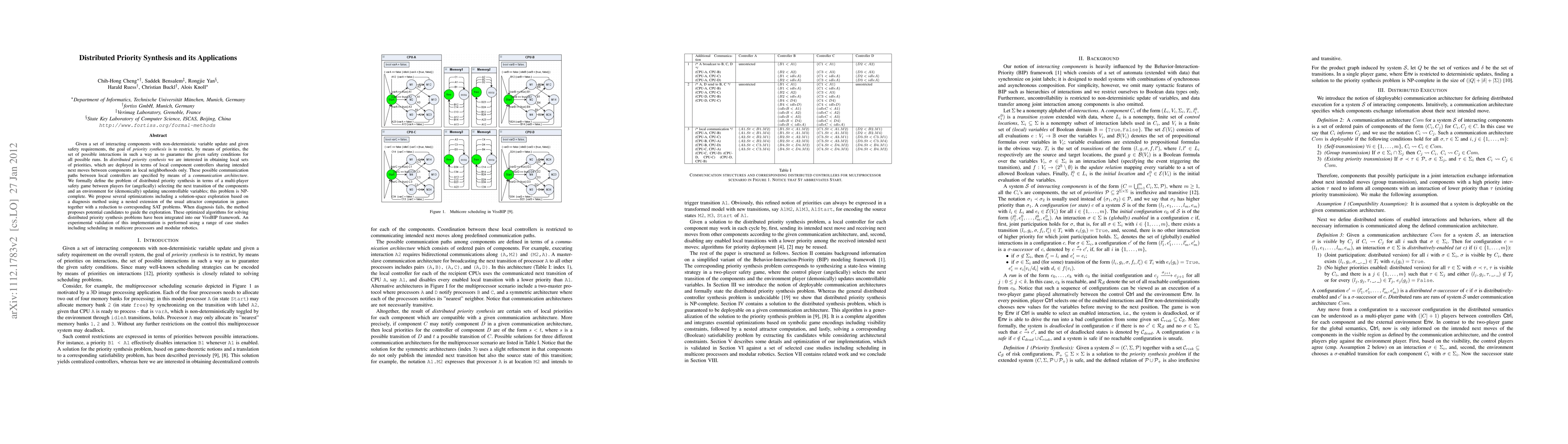 Given a set of interacting components with non-deterministic variable update and given safety requirements, the goal of priority synthesis is to restrict, by means of priorities, the set of possible interactions in such a way as to guarantee the given safety conditions for all possible runs. In distributed priority synthesis we are interested in obtaining local sets of priorities, which are deployed in terms of local component controllers sharing intended next moves between components in local neighborhoods only. These possible communication paths between local controllers are specified by means of a communication architecture. We formally define the problem of distributed priority synthesis in terms of a multi-player safety game between players for (angelically) selecting the next transition of the components and an environment for (demonically) updating uncontrollable variables; this problem is NP-complete. We propose several optimizations including a solution-space exploration based on a diagnosis method using a nested extension of the usual attractor computation in games together with a reduction to corresponding SAT problems. When diagnosis fails, the method proposes potential candidates to guide the exploration. These optimized algorithms for solving distributed priority synthesis problems have been integrated into our VissBIP framework. An experimental validation of this implementation is performed using a range of case studies including scheduling in multicore processors and modular robotics.