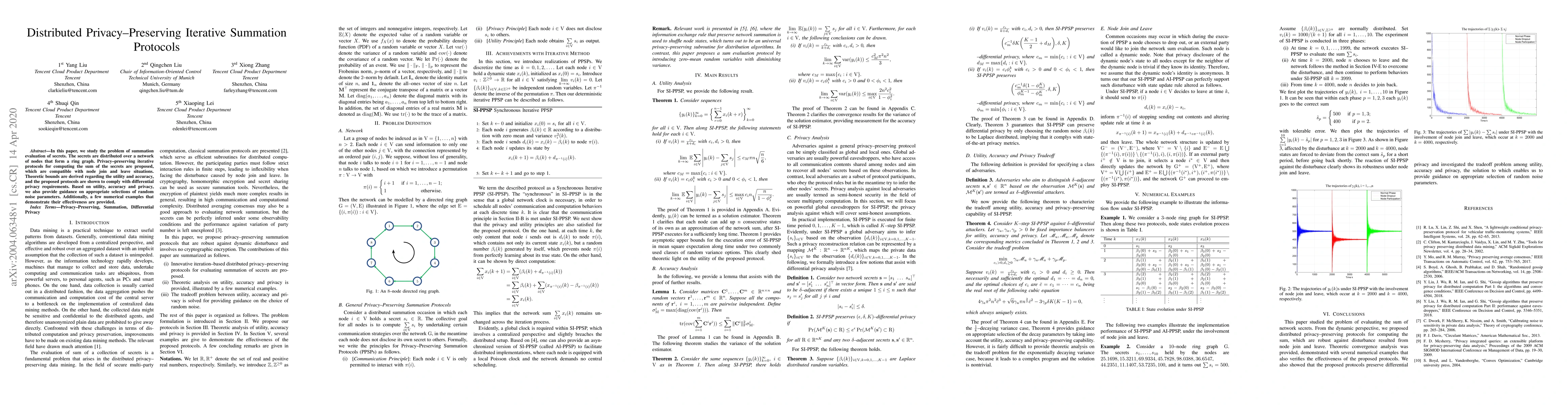 This paper proposes privacy-preserving iterative protocols for computing the sum of secrets distributed across a ring graph network, accommodating node join and leave scenarios. The protocols comply with differential privacy and provide guidance on selecting random noise parameters for optimal utility, accuracy, and privacy.