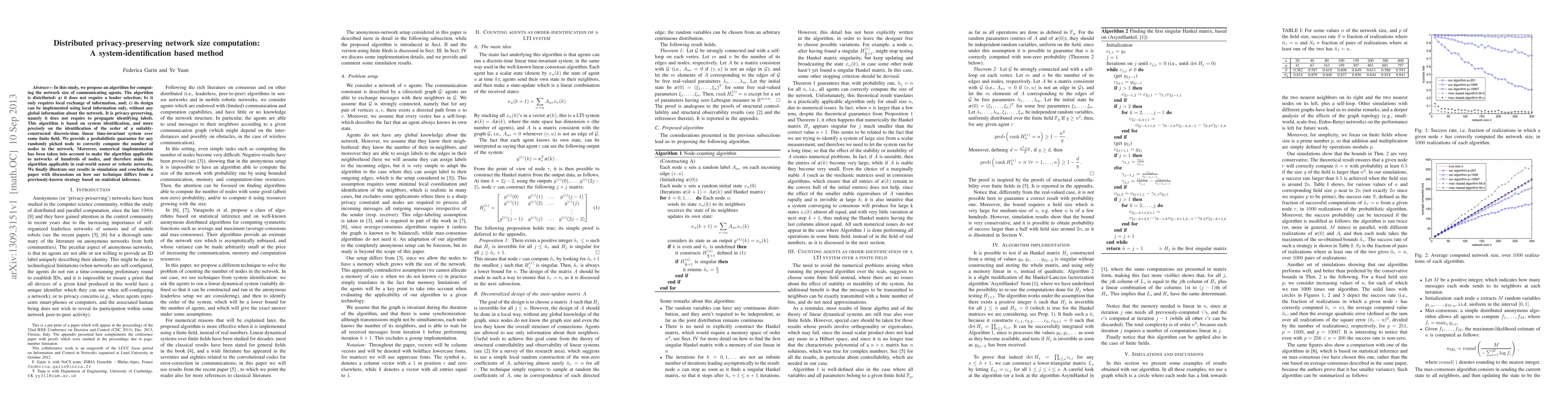 In this study, we propose an algorithm for computing the network size of communicating agents. The algorithm is distributed: a) it does not require a leader selection; b) it only requires local exchange of information, and; c) its design can be implemented using local information only, without any global information about the network. It is privacy-preserving, namely it does not require to propagate identifying labels. This algorithm is based on system identification, and more precisely on the identification of the order of a suitably-constructed discrete-time linear time-invariant system over some finite field. We provide a probabilistic guarantee for any randomly picked node to correctly compute the number of nodes in the network. Moreover, numerical implementation has been taken into account to make the algorithm applicable to networks of hundreds of nodes, and therefore make the algorithm applicable in real-world sensor or robotic networks. We finally illustrate our results in simulation and conclude the paper with discussions on how our technique differs from a previously-known strategy based on statistical inference.