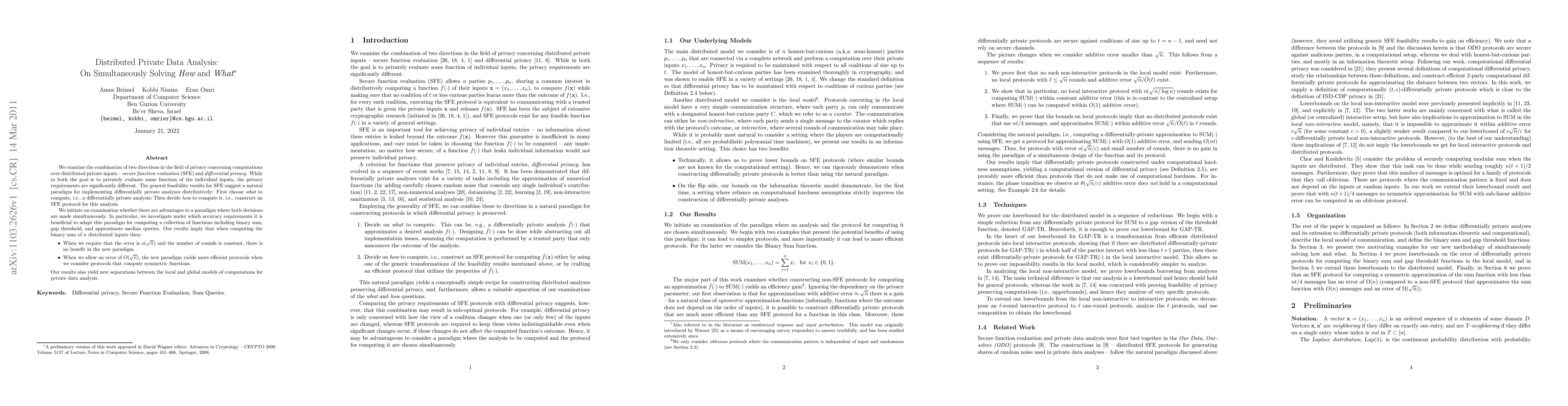 We examine the combination of two directions in the field of privacy concerning computations over distributed private inputs - secure function evaluation (SFE) and differential privacy. While in both the goal is to privately evaluate some function of the individual inputs, the privacy requirements are significantly different. The general feasibility results for SFE suggest a natural paradigm for implementing differentially private analyses distributively: First choose what to compute, i.e., a differentially private analysis; Then decide how to compute it, i.e., construct an SFE protocol for this analysis. We initiate an examination whether there are advantages to a paradigm where both decisions are made simultaneously. In particular, we investigate under which accuracy requirements it is beneficial to adapt this paradigm for computing a collection of functions including binary sum, gap threshold, and approximate median queries. Our results imply that when computing the binary sum of $n$ distributed inputs then: * When we require that the error is $o(\sqrt{n})$ and the number of rounds is constant, there is no benefit in the new paradigm. * When we allow an error of $O(\sqrt{n})$, the new paradigm yields more efficient protocols when we consider protocols that compute symmetric functions. Our results also yield new separations between the local and global models of computations for private data analysis.
