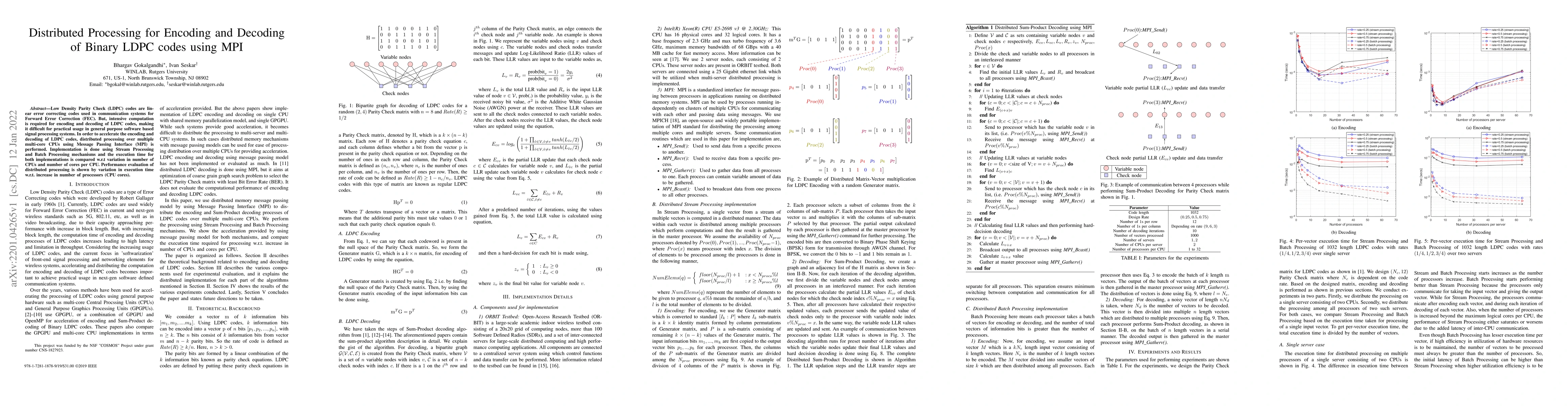 This paper explores distributed processing using MPI for encoding and decoding of LDPC codes across multiple multi-core CPUs, employing Stream and Batch Processing mechanisms. Performance evaluation demonstrates how execution time varies with the number of CPUs and cores, highlighting the benefits of distributed processing for accelerating LDPC computations.