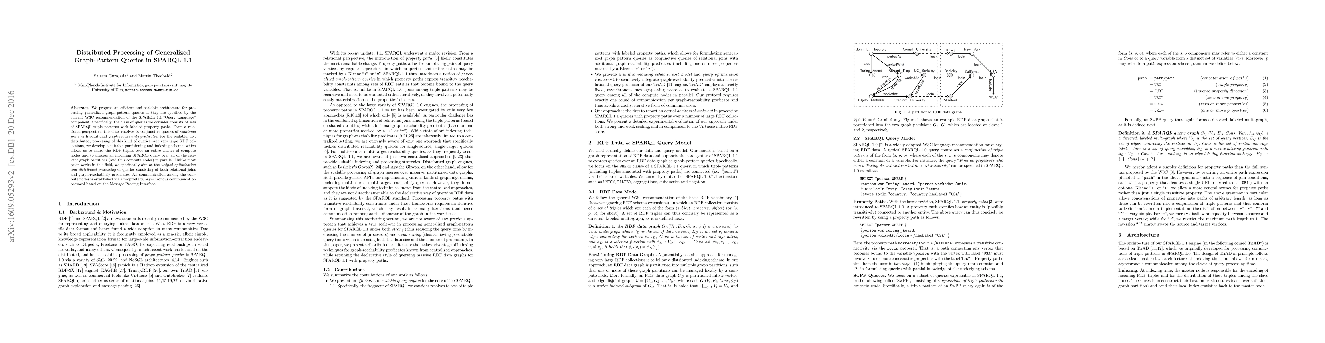 This paper proposes an architecture for efficiently processing generalized graph-pattern queries in SPARQL over large RDF collections by partitioning and indexing RDF triples across a distributed cluster. It focuses on the optimization and parallel processing of queries involving both relational joins and graph-reachability predicates using an asynchronous communication protocol.