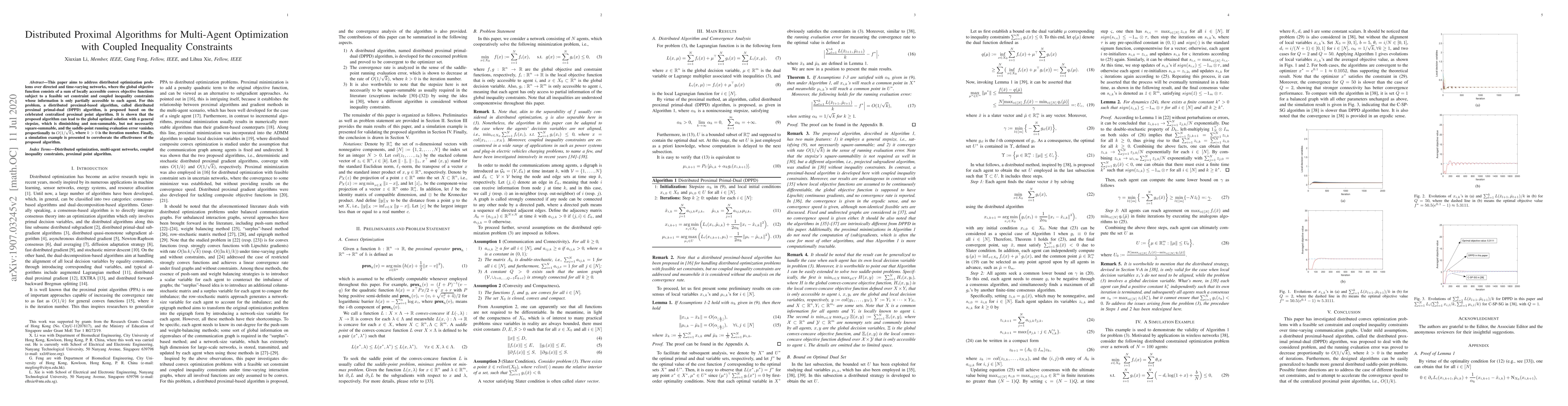 This paper proposes a distributed proximal primal-dual (DPPD) algorithm for multi-agent optimization over time-varying networks with coupled inequality constraints. The DPPD algorithm, based on a centralized proximal point method, achieves global optimality with diminishing stepsize and $O(1/\sqrt{k})$ convergence rate, validated by a simulation example.
