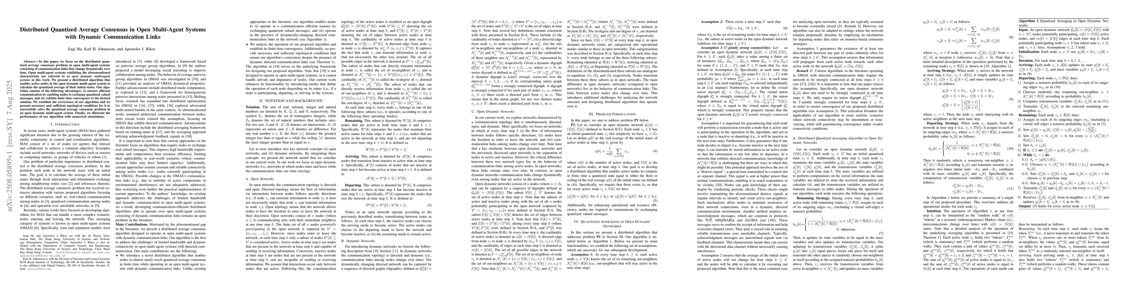 In this paper, we focus on the distributed quantized average consensus problem in open multi-agent systems consisting of communication links that change dynamically over time. Open multi-agent systems exhibiting the aforementioned characteristic are referred to as \textit{open dynamic multi-agent systems} in this work. We present a distributed algorithm that enables active nodes in the open dynamic multi-agent system to calculate the quantized average of their initial states. Our algorithm consists of the following advantages: (i) ensures efficient communication by enabling nodes to exchange quantized valued messages, and (ii) exhibits finite time convergence to the desired solution. We establish the correctness of our algorithm and we present necessary and sufficient topological conditions for it to successfully solve the quantized average consensus problem in an open dynamic multi-agent system. Finally, we illustrate the performance of our algorithm with numerical simulations.