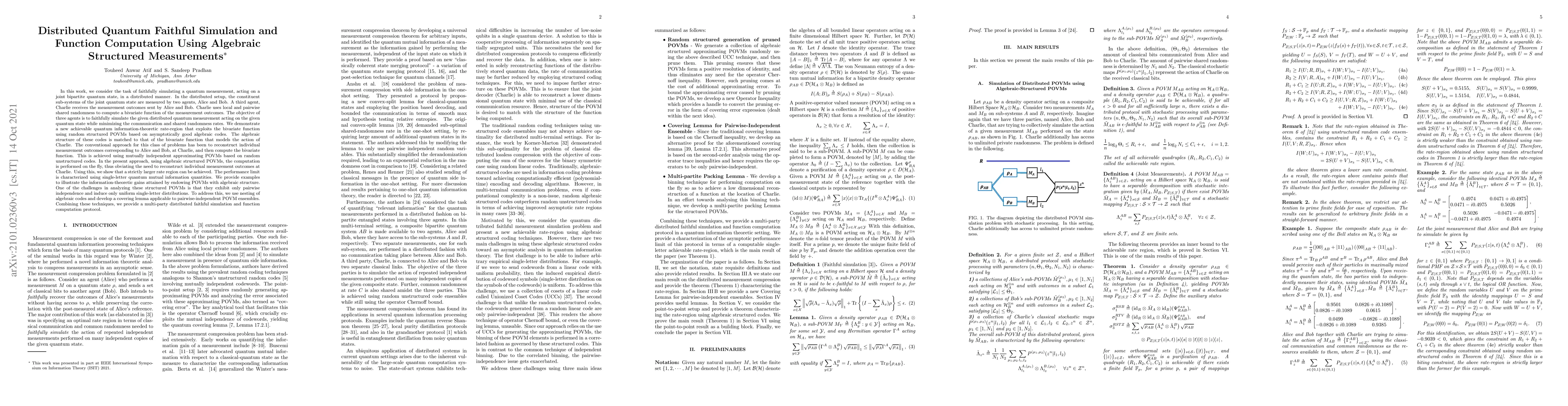 In this work, we consider the task of faithfully simulating a quantum measurement, acting on a joint bipartite quantum state, in a distributed manner. In the distributed setup, the constituent sub-systems of the joint quantum state are measured by two agents, Alice and Bob. A third agent, Charlie receives the measurement outcomes sent by Alice and Bob. Charlie uses local and pairwise shared randomness to compute a bivariate function of the measurement outcomes. The objective of three agents is to faithfully simulate the given distributed quantum measurement acting on the given quantum state while minimizing the communication and shared randomness rates. We demonstrate a new achievable information-theoretic rate-region that exploits the bivariate function using random structured POVMs based on asymptotically good algebraic codes. The algebraic structure of these codes is matched to that of the bivariate function that models the action of Charlie. The conventional approach for this class of problems has been to reconstruct individual measurement outcomes corresponding to Alice and Bob, at Charlie, and then compute the bivariate function, achieved using mutually independent approximating POVMs based on random unstructured codes. In the present approach, using algebraic structured POVMs, the computation is performed on the fly, thus obviating the need to reconstruct individual measurement outcomes at Charlie. Using this, we show that a strictly larger rate region can be achieved. One of the challenges in analyzing these structured POVMs is that they exhibit only pairwise independence and induce only uniform single-letter distributions. To address this, we use nesting of algebraic codes and develop a covering lemma applicable to pairwise-independent POVM ensembles. Combining these techniques, we provide a multi-party distributed faithful simulation and function computation protocol.