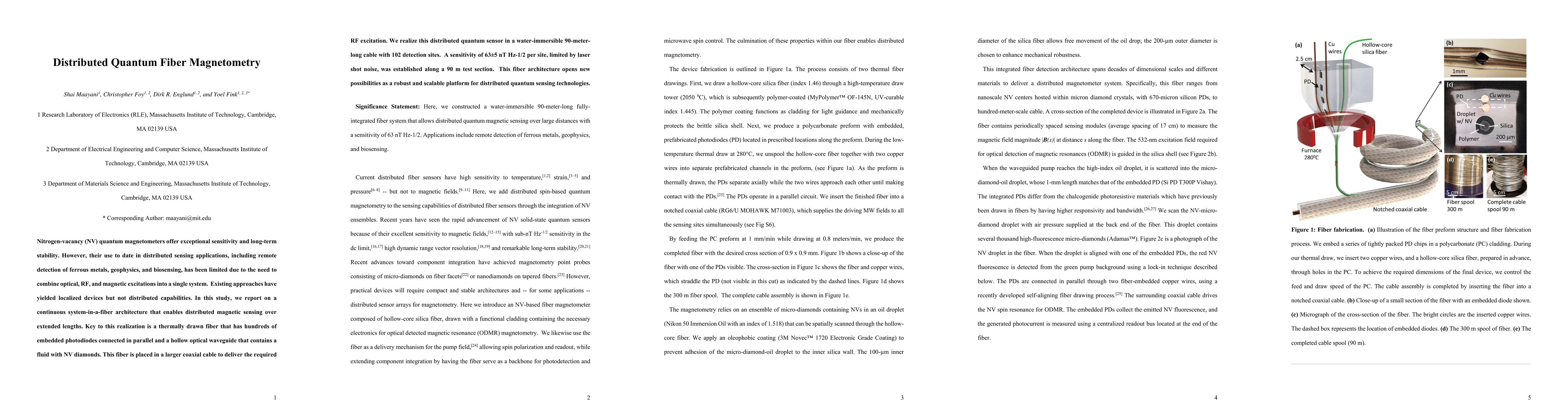 Nitrogen-vacancy (NV) quantum magnetometers offer exceptional sensitivity and long-term stability. However, their use to date in distributed sensing applications, including remote detection of ferrous metals, geophysics, and biosensing, has been limited due to the need to combine optical, RF, and magnetic excitations into a single system. Existing approaches have yielded localized devices but not distributed capabilities. In this study, we report on a continuous system-in-a-fiber architecture that enables distributed magnetic sensing over extended lengths. Key to this realization is a thermally drawn fiber that has hundreds of embedded photodiodes connected in parallel and a hollow optical waveguide that contains a fluid with NV diamonds. This fiber is placed in a larger coaxial cable to deliver the required RF excitation. We realize this distributed quantum sensor in a water-immersible 90-meter-long cable with 102 detection sites. A sensitivity of 63 nT Hz-1/2 per site, limited by laser shot noise, was established along a 90 m test section. This fiber architecture opens new possibilities as a robust and scalable platform for distributed quantum sensing technologies.