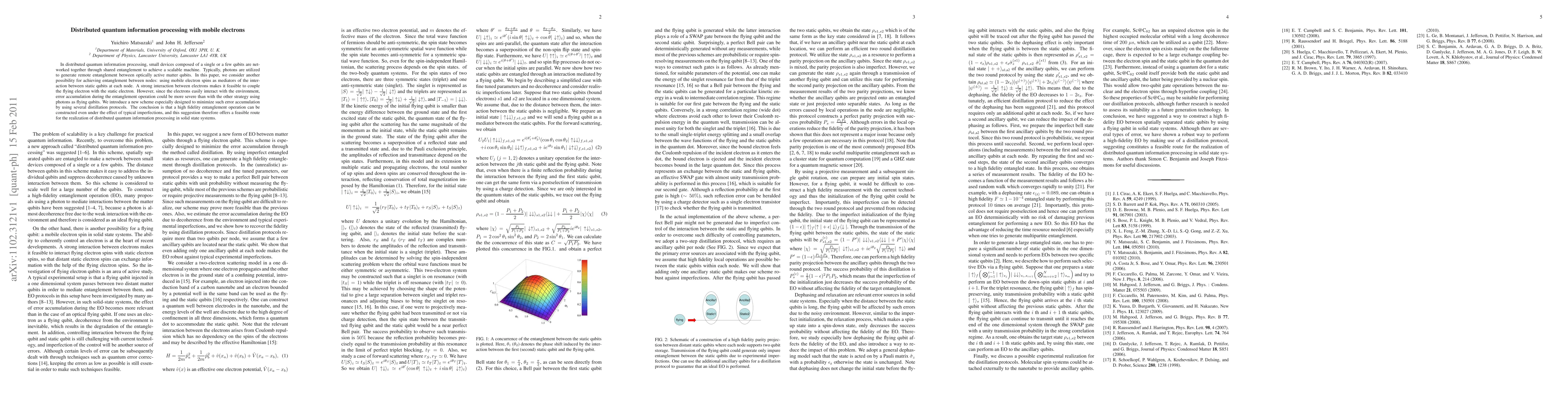 The paper presents a novel scheme for distributed quantum information processing using mobile electron spins, along with distillation protocols to mitigate errors.