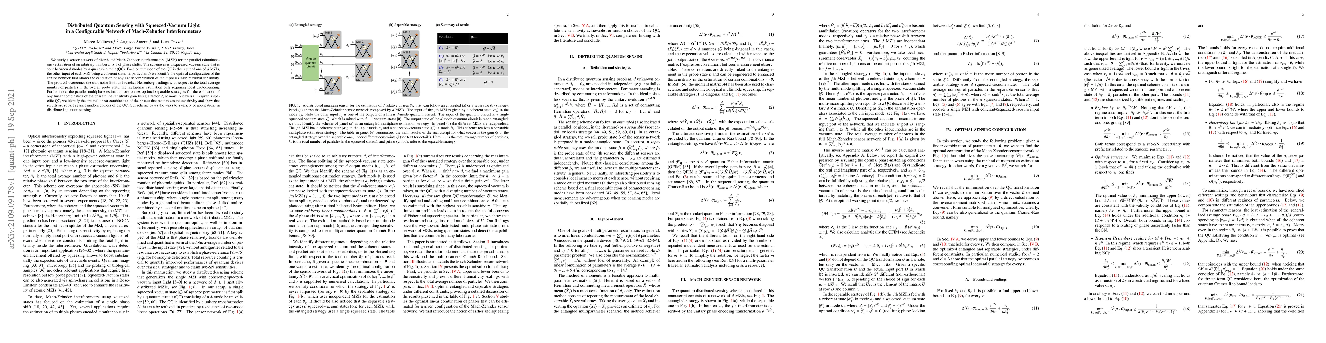 This research presents a quantum sensing network using squeezed-vacuum light and Mach-Zehnder interferometers for simultaneous estimation of multiple phase shifts, surpassing shot-noise limits and offering Heisenberg scalings. It identifies optimal configurations for phase estimation and demonstrates robustness against random quantum circuit choices, opening avenues for distributed quantum sensing applications.