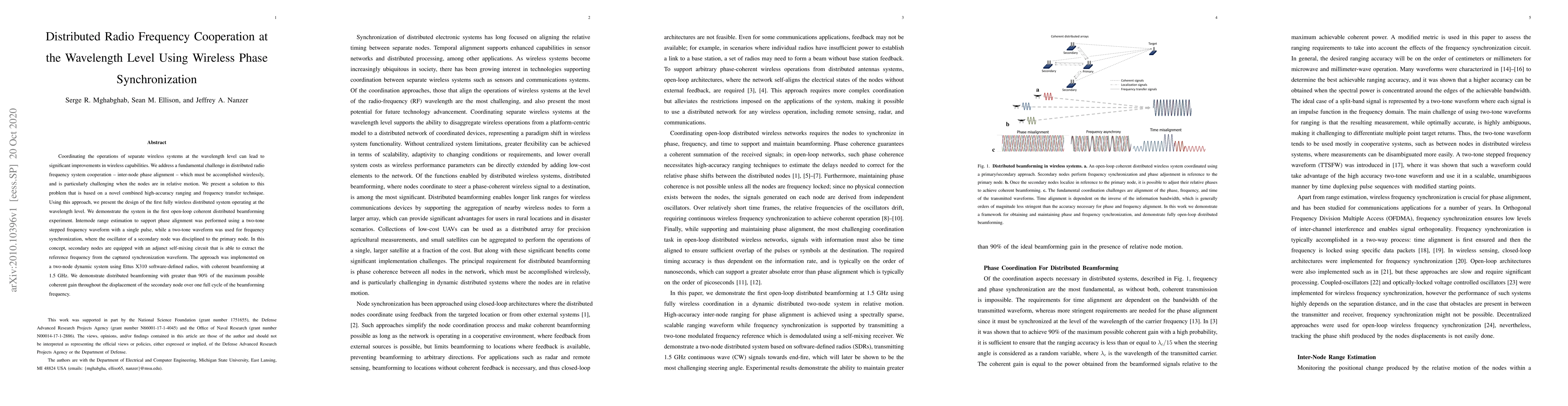 This paper presents a novel wireless phase synchronization technique for distributed radio frequency systems to achieve wavelength-level coordination, enabling coherent beamforming despite node mobility. The method uses a two-tone stepped frequency waveform for range estimation and a two-tone waveform for frequency synchronization, demonstrating a fully wireless system with over 90% coherent gain.