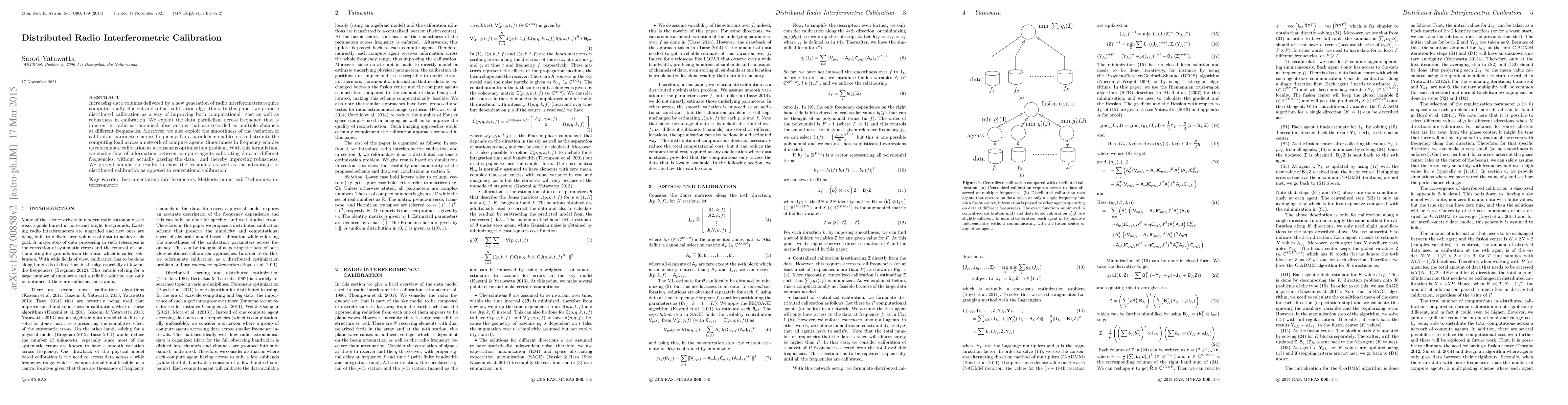 This paper proposes distributed calibration to enhance computational efficiency and robustness for radio interferometric data. It leverages data parallelism across frequency channels and the smoothness of calibration parameters to reformulate calibration as a consensus optimization problem, enabling information flow between compute agents without data transfer. Simulation results demonstrate the benefits of this approach over conventional calibration methods.