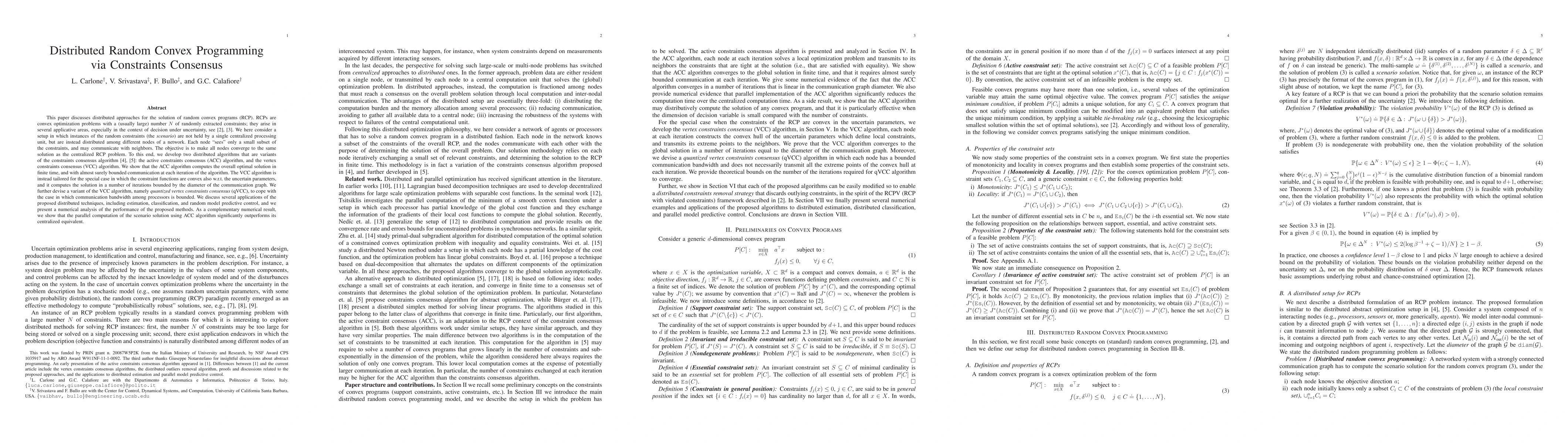 This paper proposes distributed algorithms for solving random convex programs (RCP) distributed across a network, introducing the active constraints consensus (ACC) and vertex constraints consensus (VCC) algorithms. The ACC algorithm achieves optimal solutions in finite time with bounded communication, while the VCC algorithm is optimized for convex constraint functions and is bounded by the communication graph's diameter. The paper also presents a quantized variant of VCC to manage limited communication bandwidth and discusses applications in estimation, classification, and control.