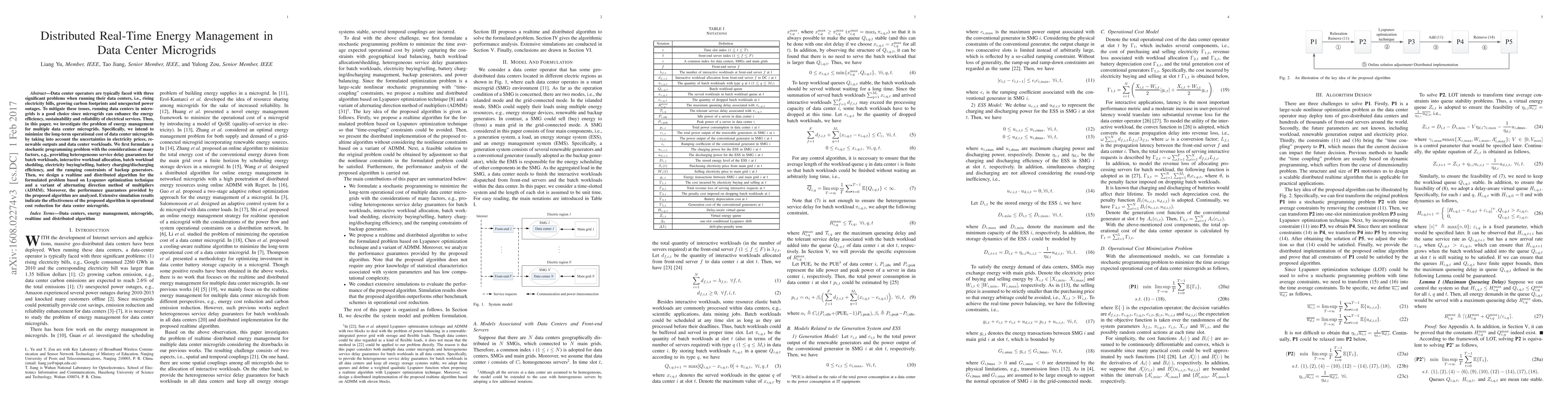 This paper proposes a distributed real-time energy management strategy for data center microgrids to minimize operational costs while considering uncertainties in electricity prices, renewable outputs, and workloads. The authors formulate a stochastic programming problem and develop a real-time distributed algorithm using Lyapunov optimization and ADMM, demonstrating its effectiveness through simulations.