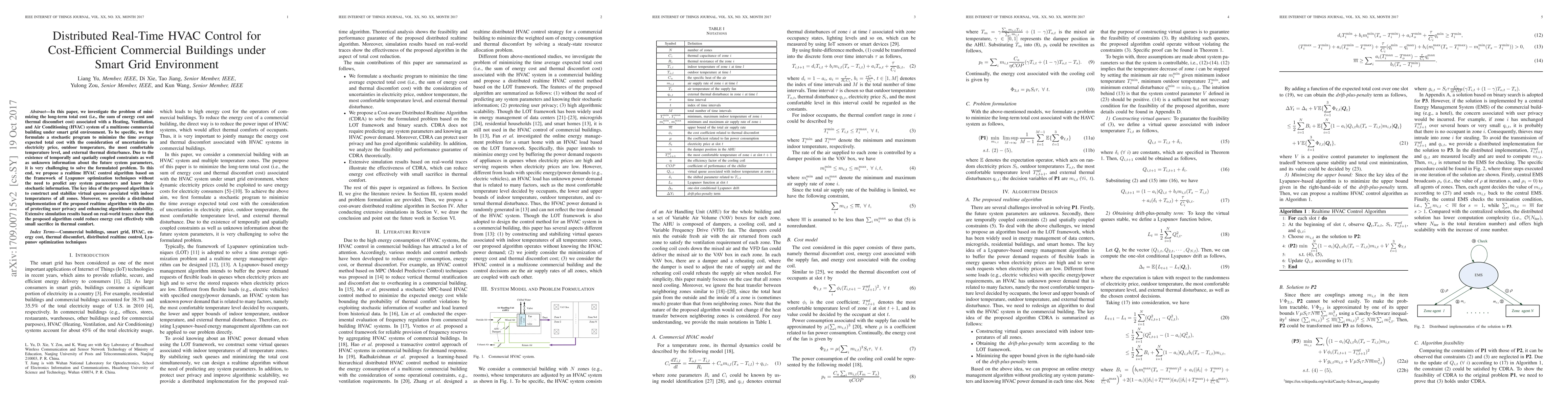 This paper proposes a real-time distributed HVAC control algorithm to minimize long-term costs in commercial buildings under smart grid conditions, using Lyapunov optimization to manage uncertainties without requiring future parameter predictions. The algorithm stabilizes virtual queues for indoor temperatures and demonstrates effective energy cost reduction with minimal thermal discomfort.