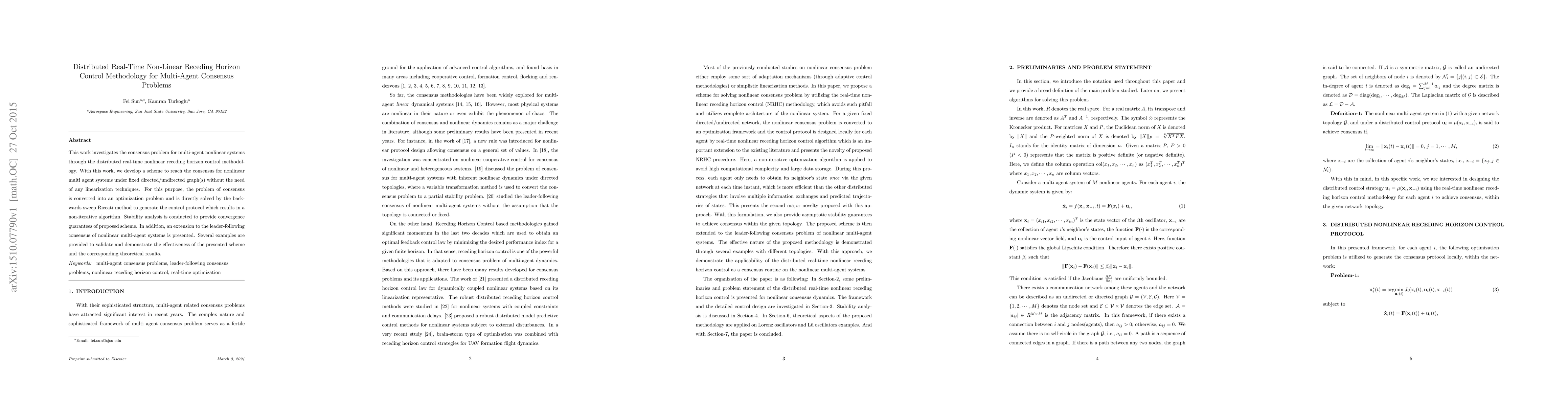 This paper proposes a distributed real-time nonlinear receding horizon control methodology for achieving consensus in multi-agent nonlinear systems without linearization, using an optimization approach solved by the backwards sweep Riccati method. The method is validated through stability analysis and examples demonstrating its effectiveness.