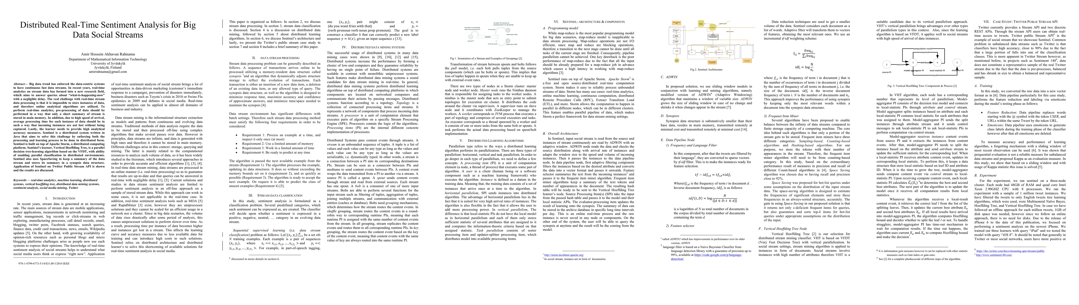 Sentinel is a distributed real-time sentiment analysis system built on Apache Storm that employs the Vertical Hoeffding Tree algorithm for parallel classification and SpaceSaving for data summarization. Its performance on Twitter streams demonstrates its capability to handle high-speed data streams while maintaining analytical accuracy.